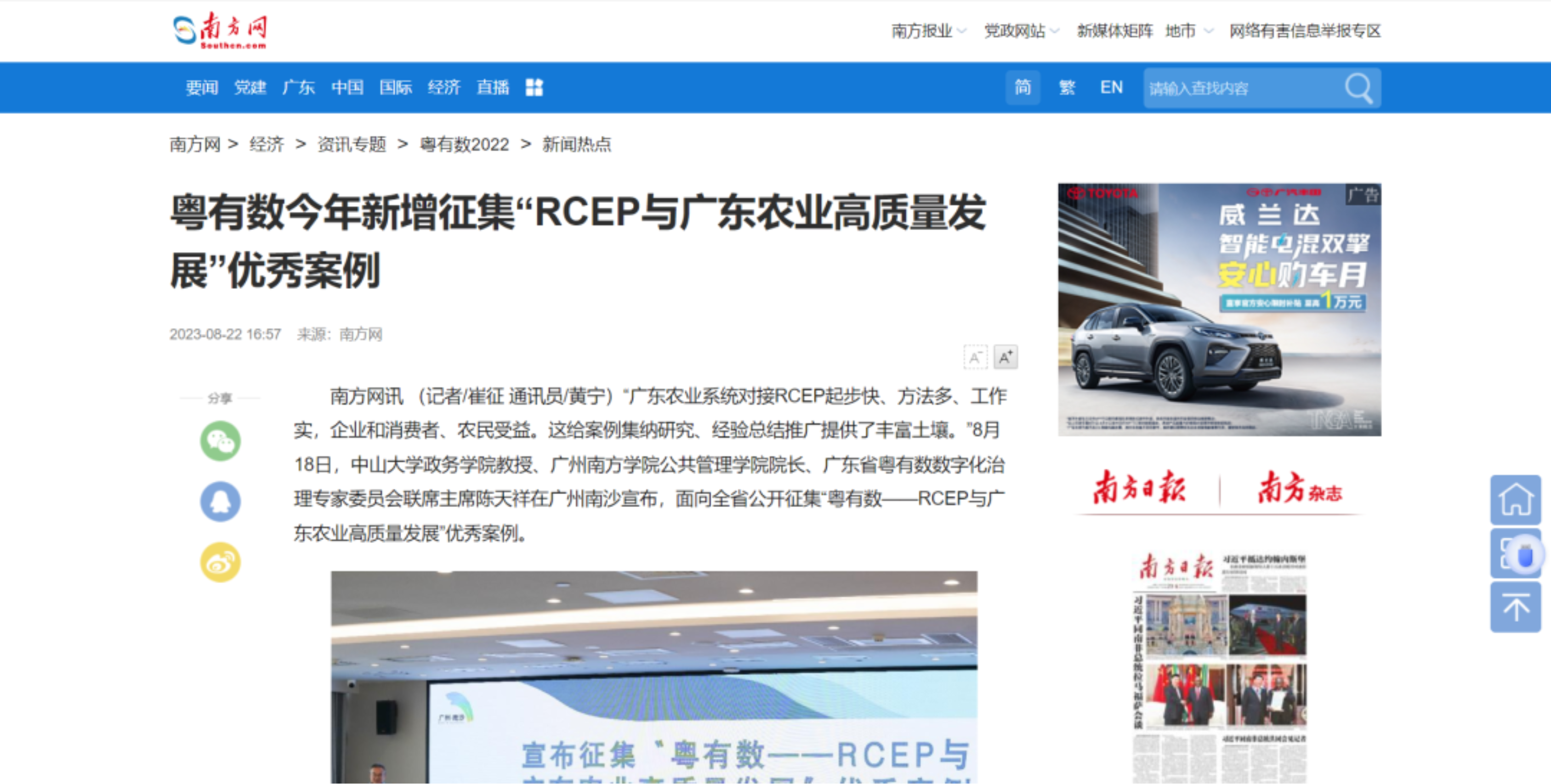 南方网讯(记者/崔征 通讯员/黄宁)“广东农业系统对接RCEP起步快、方法多、工作实,企业和消费者、农民受益。这给案例集纳研究、经验总结推广提供了丰富土壤。”8月18日,中山大学政务学院教授、william威廉中文院长、广东省粤有数数字化治理专家委员会联席主席陈天祥在广州南沙宣布,面向全省公开征集“粤有数——RCEP与广东农业高质量发展”优秀案例。