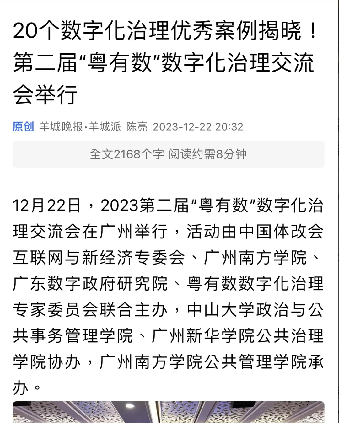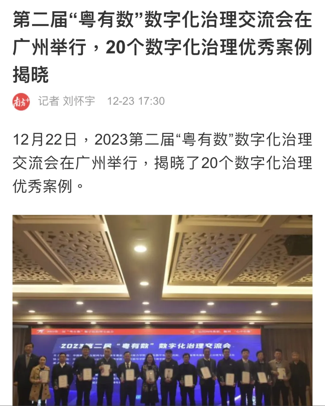 活动现场还为20个“粤有数”优秀案例颁奖。本次的优秀案例涵盖了城市治理、应急管理、税务、环境治理、医疗、文旅、社会公益、数字农业、前沿低碳的各个领域,来自政府单位企事业机关及社会团体。地域涉及广州、深圳、佛山、东莞、惠州、江门等湾区城市,以及粤东西北基层单位,充分展示了广东数字治理的多样性和全面性。其中广东省投资和信用中心、广州市越秀区政务服务数据管理局、深圳市盐田区政务服务数据管理局、佛山市禅城区智慧社会治理办公室、惠州市政务服务数据管理局、广州市河涌监测中心、国家税务总局佛山市顺德区税务局、江门市医疗保障局、肇庆市德庆县农业农村局、广东省文化和旅游发展与保障中心、中国移动通信集团广东有限公司、中国移动通信集团广东有限公司茂名分公司、中国电信股份有限公司惠州分公司、广东创能科技股份有限公司、广东中浦科技有限公司等机构获此殊荣。陈天祥、陈杰华和蓝云在《中共中央党校(国家行政学院)学报》发表的论文《全流程制度驱动:数字技术如何赋能敏捷治理》荣获2023“粤有数”数字化治理·推荐论文。希望所有获奖单位和个人继续坚持系统思维、科学理念,秉承数治、智治、善治的初心,持续推动数字技术、数字应用与政府改革的深度融合,推进广东及我国的数字政府建设再上新的台阶!