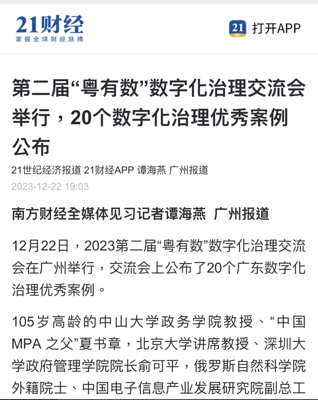105岁高龄的中山大学政务学院教授、“中国 MPA 之父”夏书章,北京大学讲席教授、深圳大学政府管理学院院长俞可平,俄罗斯自然科学院外籍院士、中国电子信息产业发展研究院副总工程师刘权,暨南大学新闻与传播学院名誉院长、原南方日报社社长范以锦等四位“粤有数”首席专家为活动发来寄语,对第二届“粤有数”优秀案例评选活动的成功举办表示祝贺,并勉励“粤有数”要与时代同行,活动能够越办越好,越来越有数,为促进数字化时代的善治作出更多的贡献。