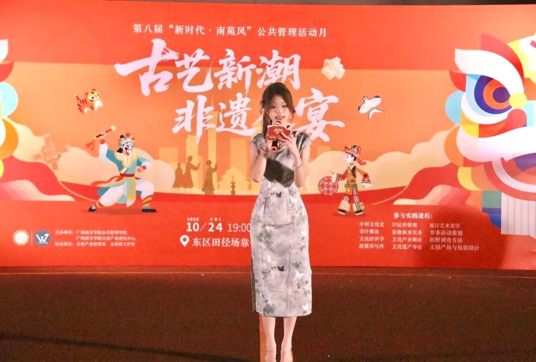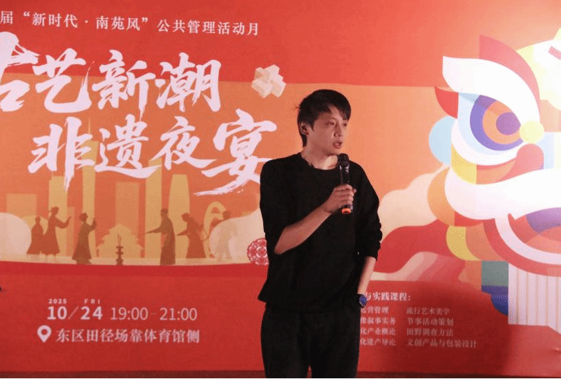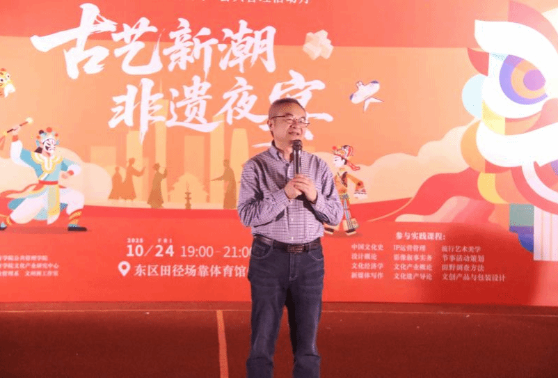 随后,文化产业管理专业负责人周先捷副教授从专业视角精准概括了本次“夜市”的创新性:它巧妙融合“古艺”与“新潮”,打造了一个 “可感知、可互动、可消费的文化空间” ,是一种积极的、创新性的传承实践。同时,也将这次活动视为对文管专业同学的宝贵学习机会,鼓励大家以专业眼光去观察背后的“运营逻辑、体验设计与文化传播策略”,期待同学们未来成为连接传统与现代的“创意人才”。