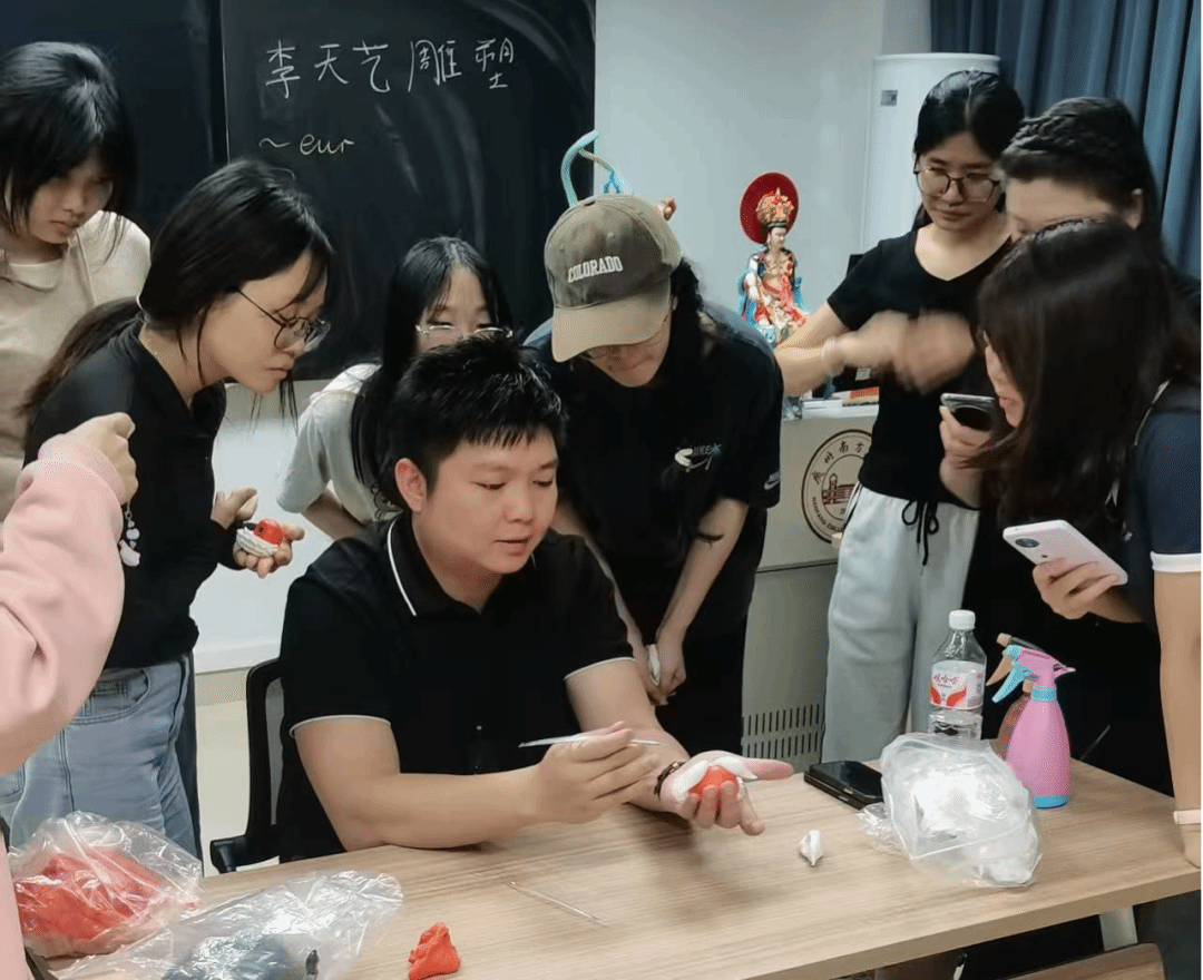 在醒狮面塑教学环节,同学们围在桌前,认真观摩李老师的每一个动作,惊叹于普通面团在指尖下蜕变为栩栩如生醒狮的过程。