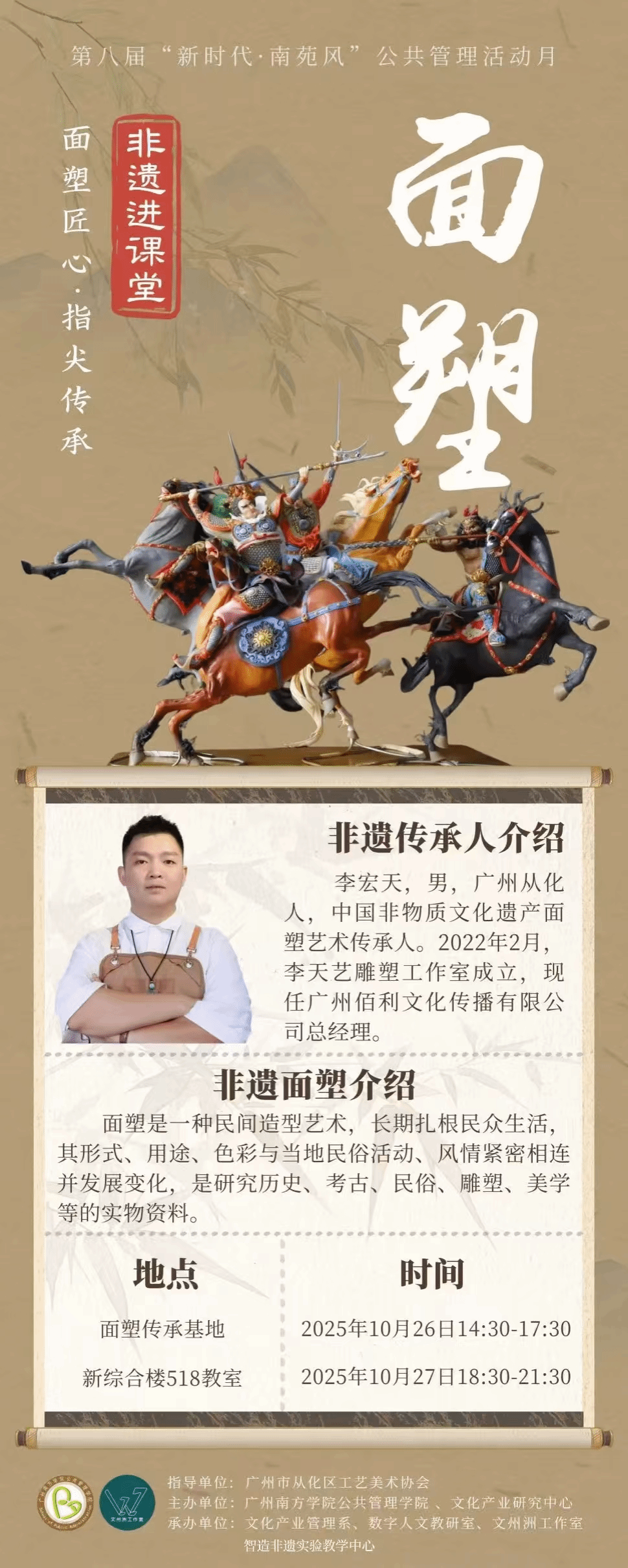 10月26日下午14:30-17:30,中国非遗面塑传承人李宏天老师与带着对面塑技艺的好奇与热忱的同学们相约非遗面塑传承基地,开启了一场“指尖上的非遗之旅”。