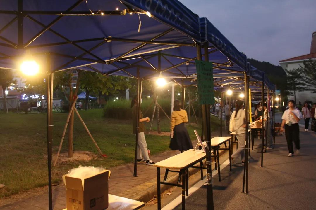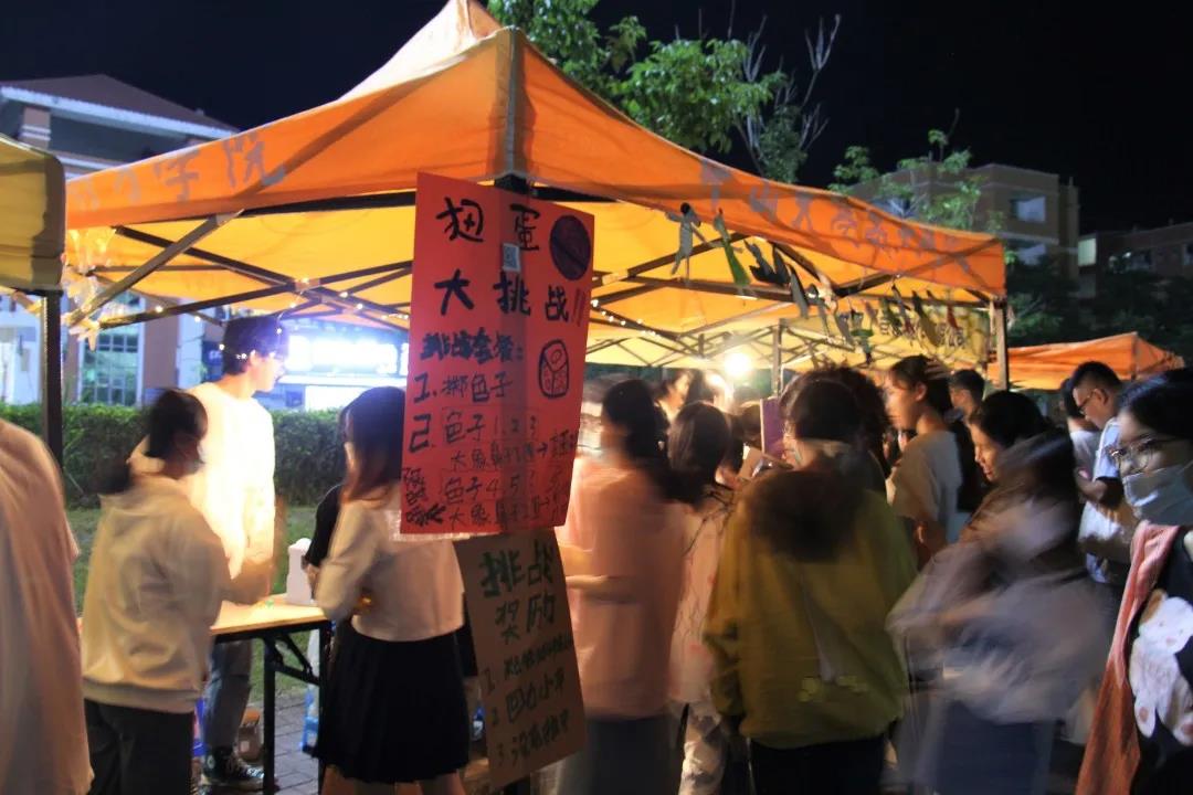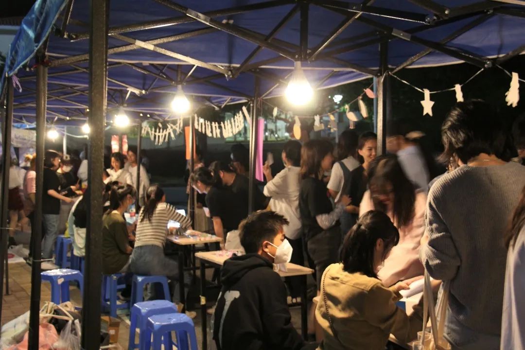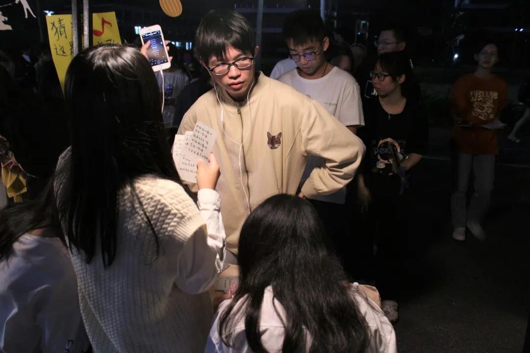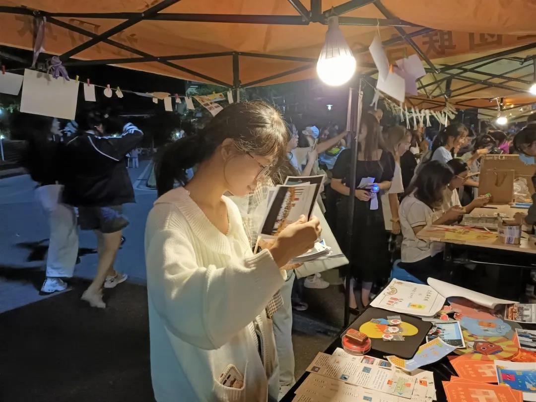 夜色渐浓,伴着凉爽的秋风,活动摊位的灯逐一亮起,丰富多样的游戏和精美的文创产品吸引了许多同学前来参与,活跃的游戏氛围让东饭周边热闹了起来。