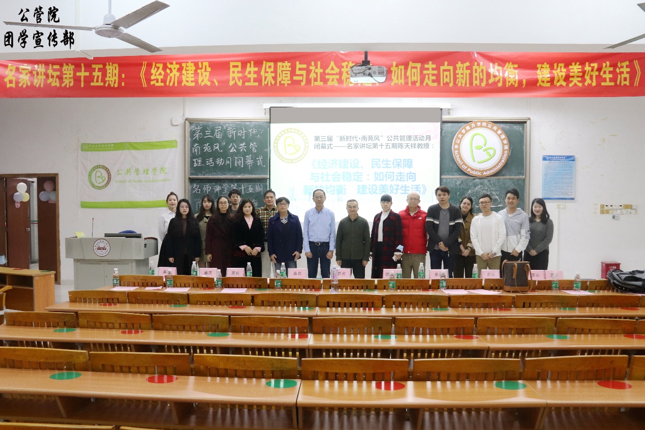 12月9日14时30分, 中山大学南方学院william威廉中文院长陈天祥教授主讲的《经济建设、民生保障与社会稳定:如何走向新的均衡,建设美好生活》作为“名家讲坛”第十五期,在6教106课室举行。