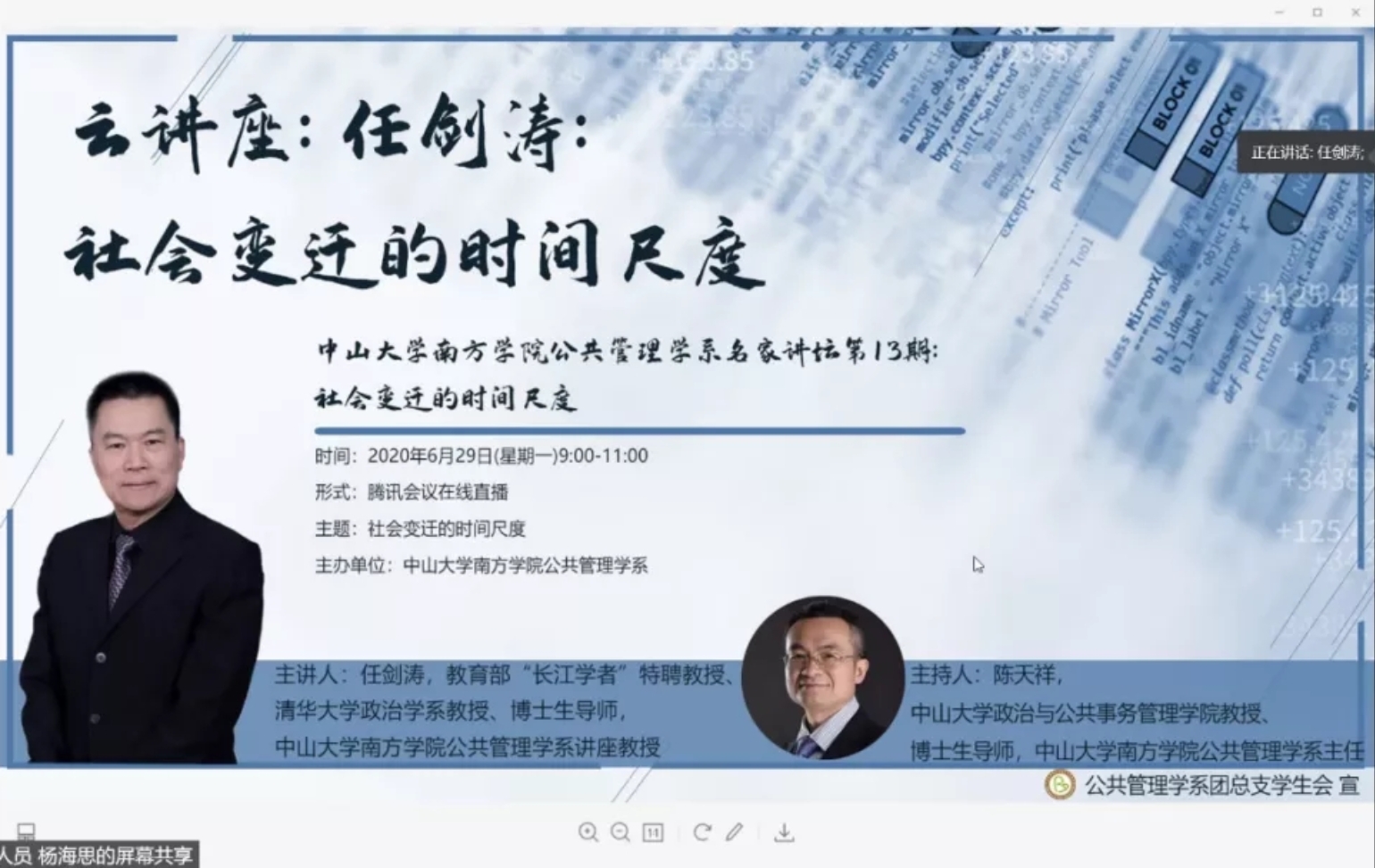 2020年6月29日上午,中山大学南方学院公共管理学系名家讲坛第十三期:《社会变迁的时间尺度》在腾讯会议顺利举行!