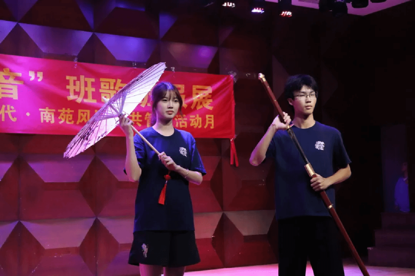 第七个出场的是文管一班,他们演唱的曲目是《稻香》,情景剧是他们对青春的表达,高高挥起的藏蓝色的班旗展现了他们勇往直前和乘风破浪的精神,扬起的纸飞机代表他们已经与过去告别,向新生活、新梦想大步前进。