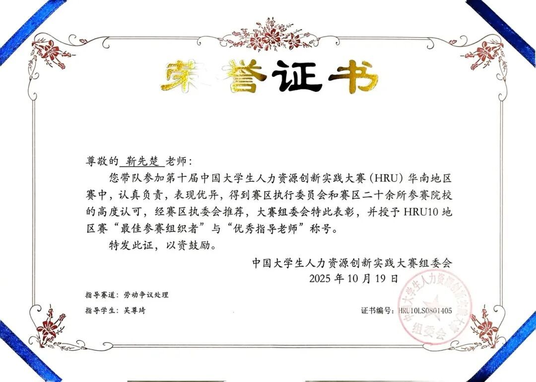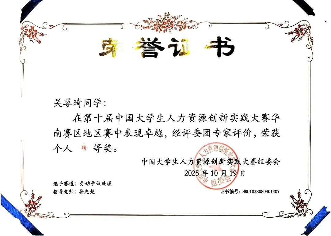 在靳先楚老师的专业指导下,吴尊琦同学在劳动争议处理赛道中荣获个人特等奖。