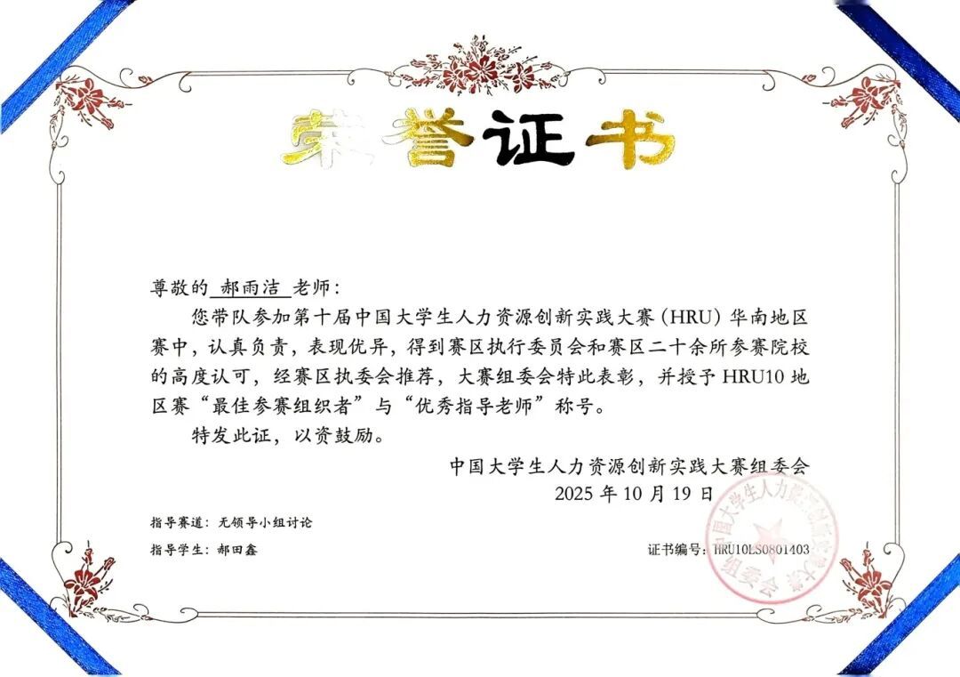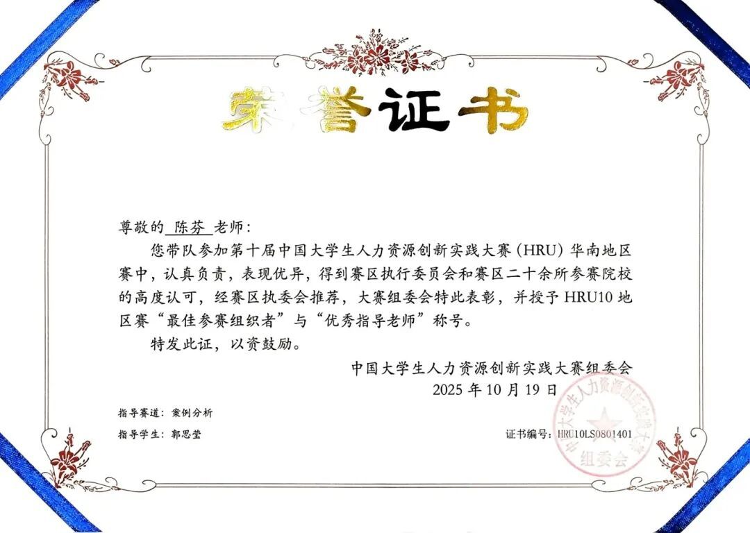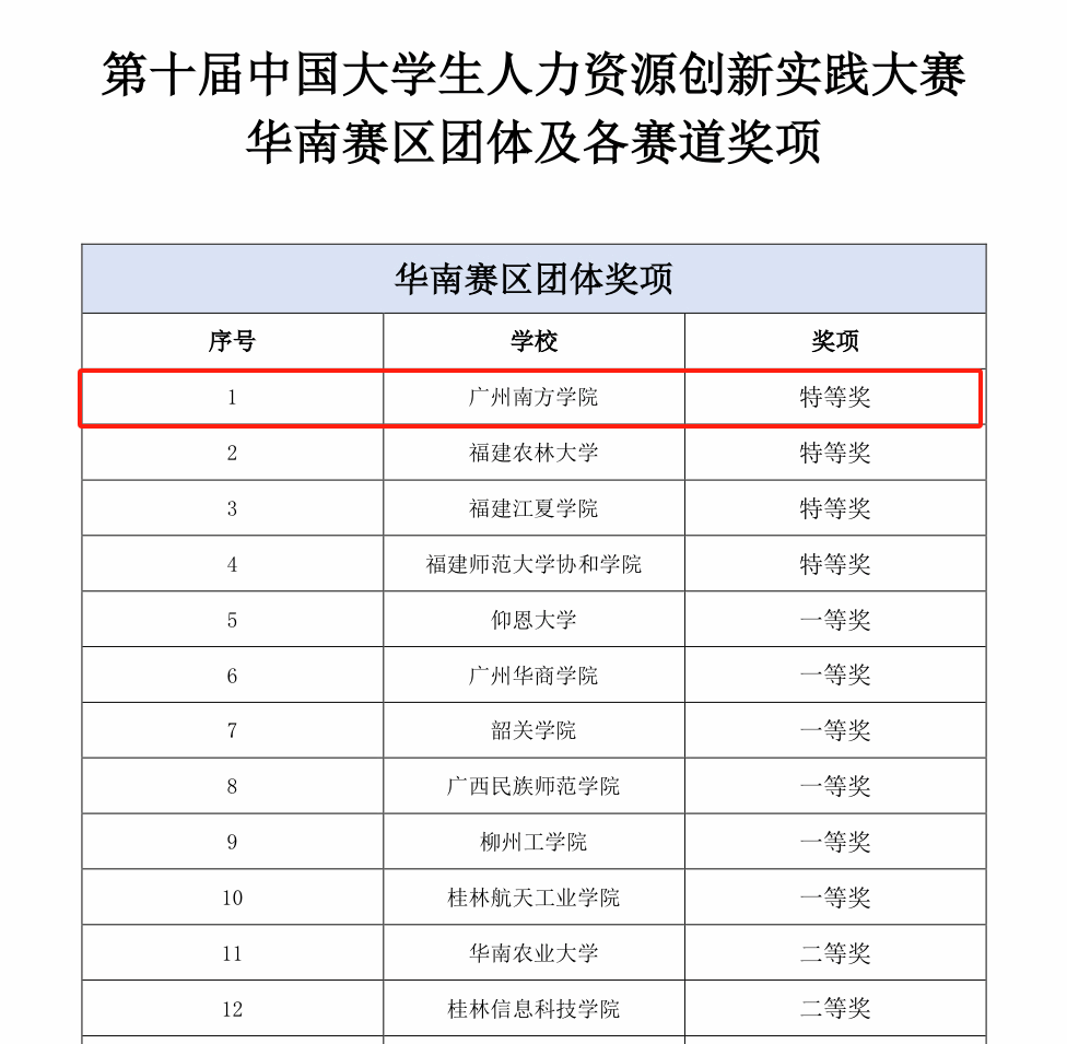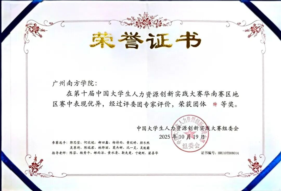 在杨秀平老师的带领下,人力资源管理专业郭思莹、吴尊琦、郝田鑫、颜乐然、黄欣婷、杨诗雨、何欣妮、莫杰妍、林烨丽、陈瑞君10名学生参赛,荣获华南赛区团体特等奖(总分排名第一),并顺利晋级决赛!
