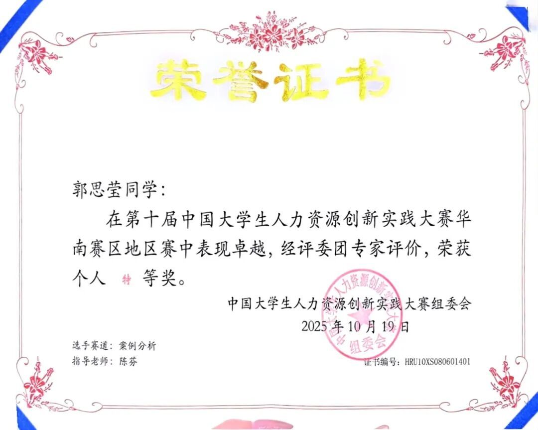 其中,在陈芬老师的专业指导下,郭思莹同学在案例分析赛道中荣获个人特等奖。