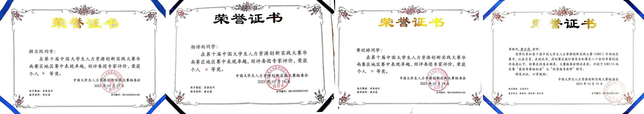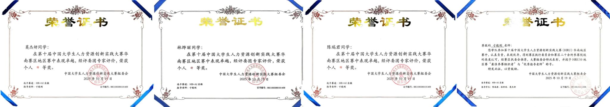 在寸晓刚老师的专业指导下,莫杰妍、林烨丽、陈瑞君同学在HR+AI数字化赛道中荣获特等奖。
