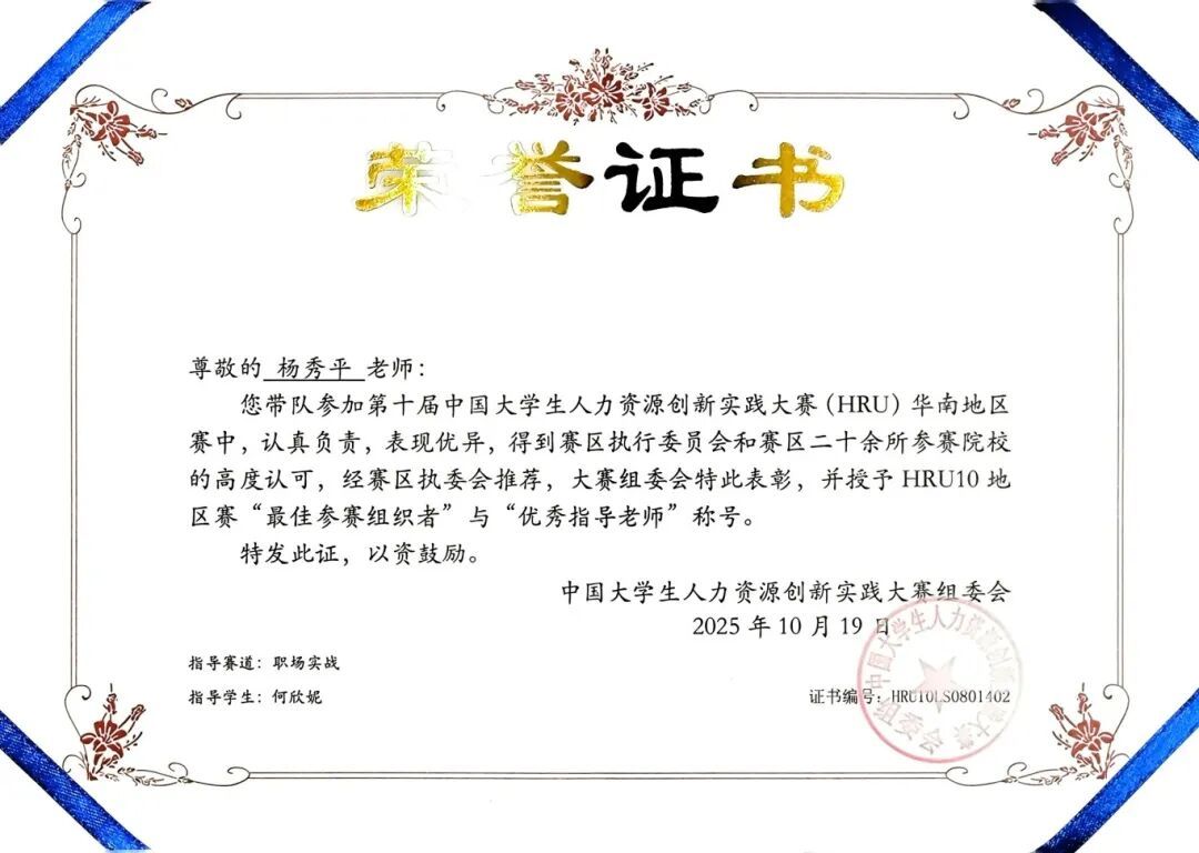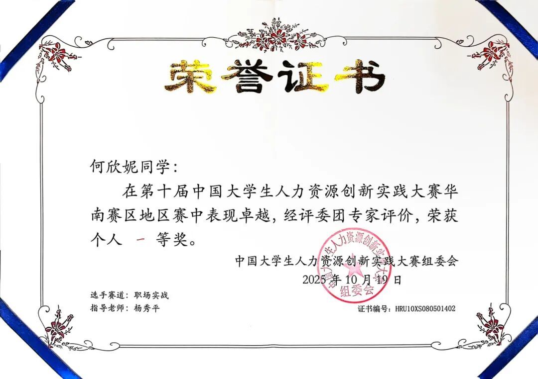 在杨秀平老师的专业指导下,何欣妮同学在职场实战赛道中荣获一等奖。