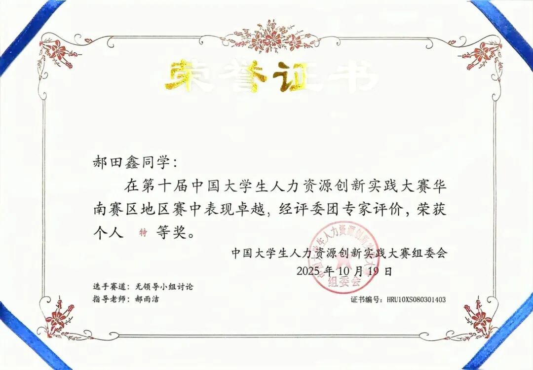 在郝雨洁老师的专业指导下,郝田鑫同学在无领导小组赛道中荣获个人特等奖。