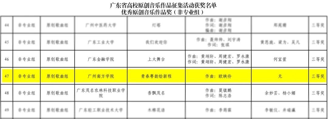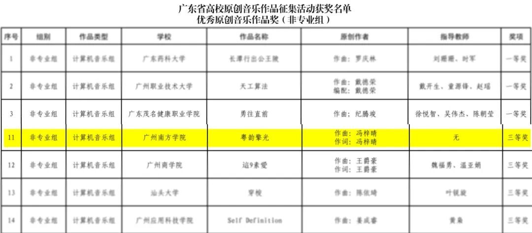 近日,2025年广东省高校原创音乐作品征集活动获奖名单揭晓,我院两名学生在此次活动中表现优异,同时斩获非专业组三等奖。