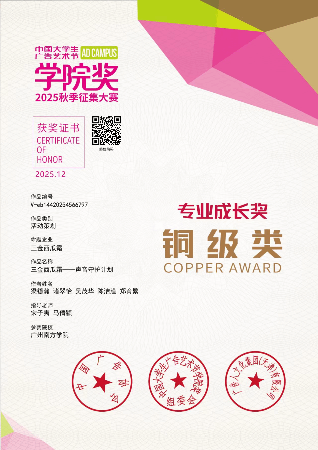 灵感源于当代人 “用嗓过度” 的生活痛点,团队聚焦教师、主播、职场人等高频用嗓群体,以 “声音守护” 为核心创意,将三金西瓜霜的产品功能与情感关怀相结合,打造出兼具实用性与感染力的传播方案。在创作过程中,团队通过多次用户调研、头脑风暴与方案迭代,不断优化创意表达与呈现形式,最终在现场展示环节收获评委高度认可,斩获铜奖