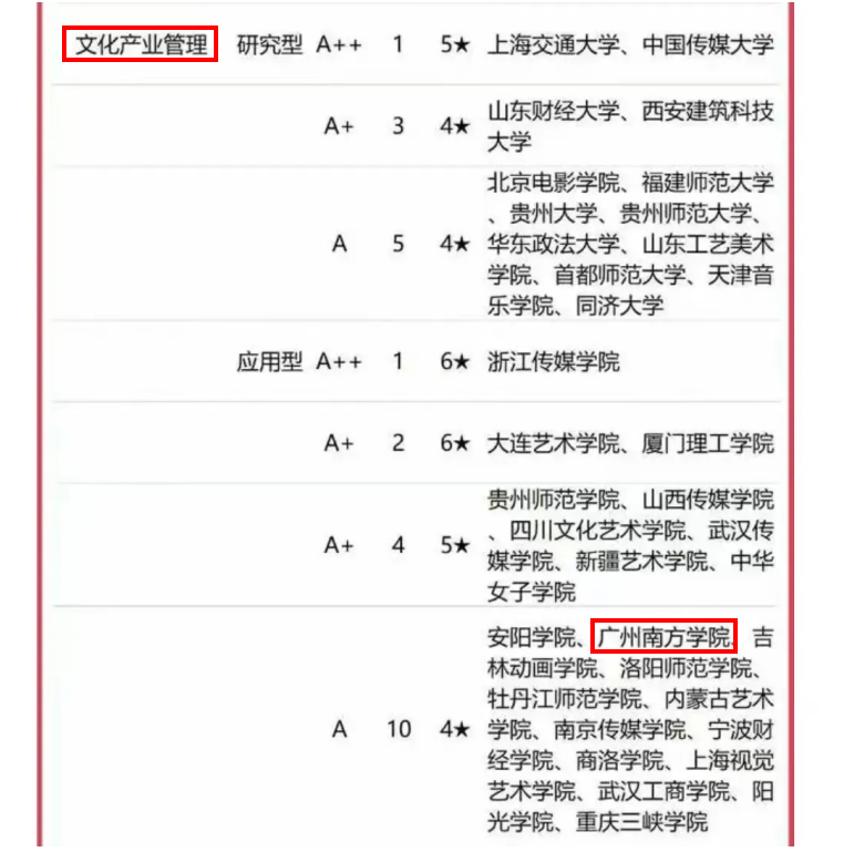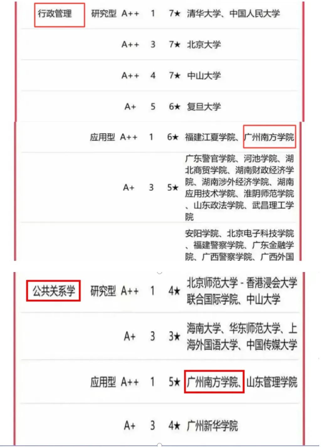 其中,行政管理专业在全国应用型大学中排名第一,获评“6星中国顶尖应用型专业”;公共关系学专业在全国应用型大学中排名第一,获评“5星中国一流应用型专业”;人力资源管理专业在全国应用型大学中排名第五,连续5年获评“6星中国顶尖应用型专业”;文化产业管理专业连续两年入榜,在全国应用型大学中排名前十,是广东省唯一入榜的本科文化产业管理专业,获评“4星中国高水平应用型专业”。