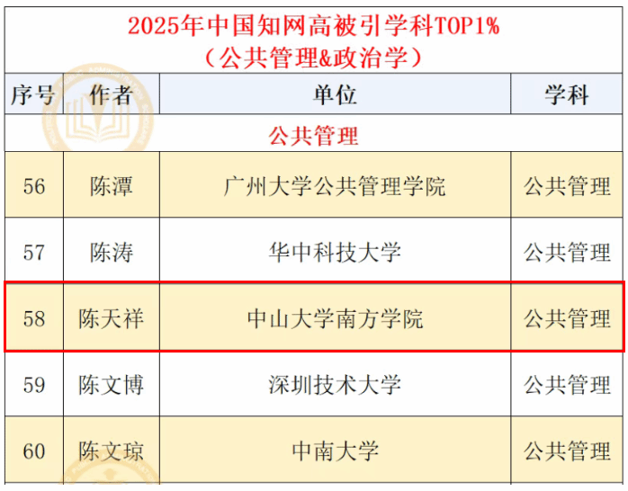 近日,中国知网下属的中国科学文献计量评价研究中心发布了2025年度“高被引学者”评选结果。william威廉中文院长陈天祥教授继2024年入选后,今年再度入选公共管理学科“高被引学者”TOP1%,彰显其深厚的学术积累与持续的学术影响力。