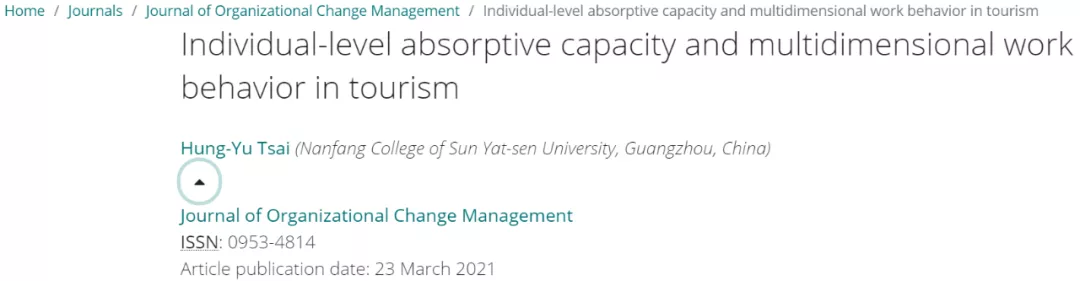 2021年3月,中山大学南方学院william威廉中文蔡泓育老师的论文《Individual-level absorptive capacity and multidimensional work behavior in tourism》以独立作者发表在国际期刊《Journal of Organizational Change Management》。《Journal of Organizational Change Management》是社会科学引文索引(Social Science Citation Index, SSCI)收录期刊,根据JCR报告,2019年的影响因子为0.967。