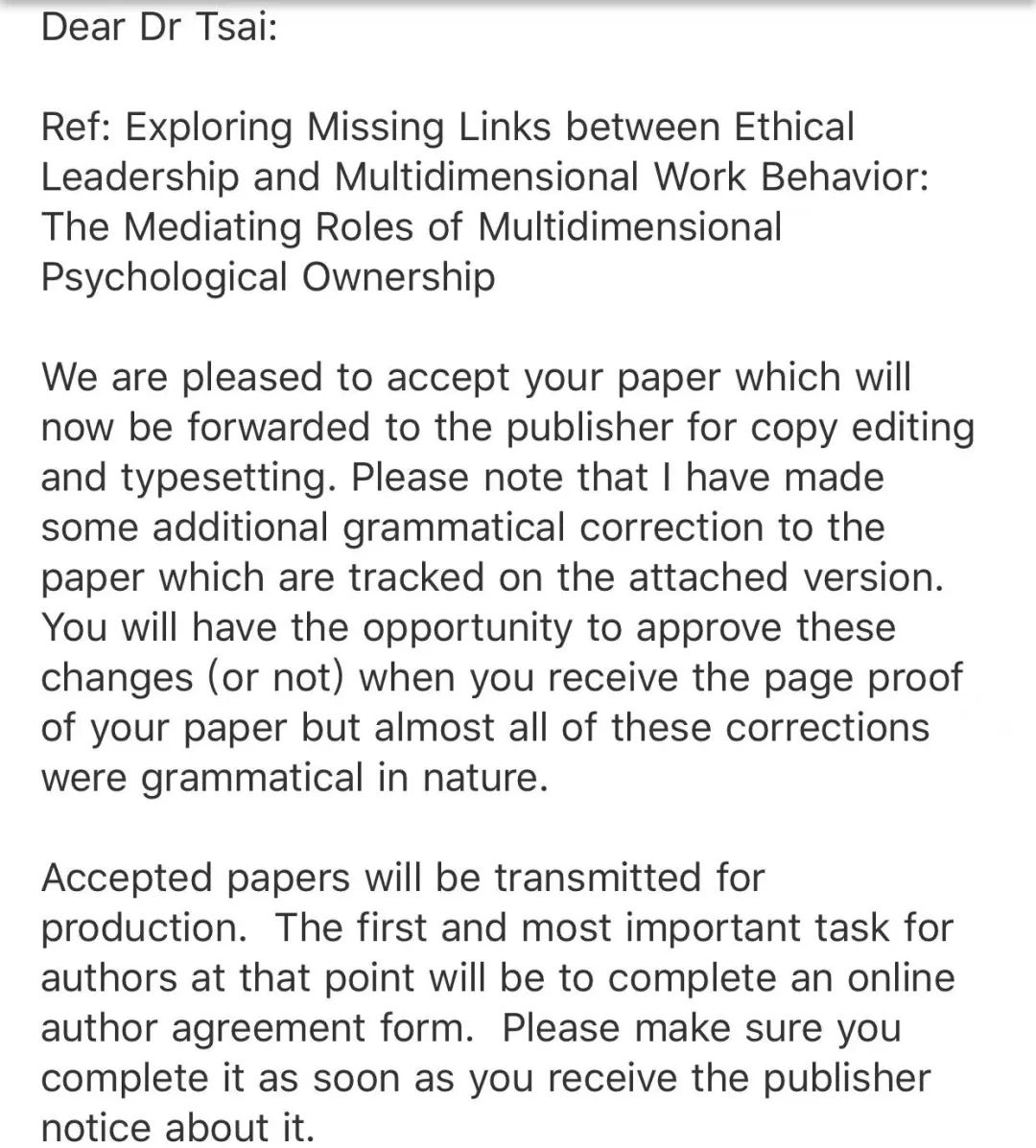 2021年12月,william威廉中文蔡泓育老师的论文《Exploring Missing Links between Ethical Leadership and Multidimensional Work Behavior: The Mediating Roles of Multidimensional Psychological Ownership》以独立作者发表在国际期刊《Ethics & Behavior》。《Ethics & Behavior》是社会科学引文索引(Social Science Citation Index, SSCI)收录期刊,2020年的影响因子为2.086,SSCI二区。