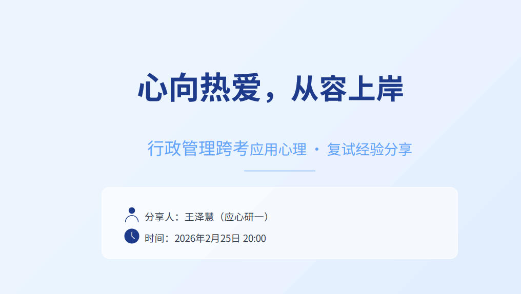 行政管理专业邀请莫琨老师与2024级应用心理专业研究生王泽慧联合主讲。王泽慧结合自身从行政管理跨考应用心理并成功调剂录取的经历,围绕复试流程、自我介绍、英语及专业问题作答等环节进行分享。她建议考生保持真诚自信,遇难题冷静思考、分点作答,并提前模拟演练,提升临场应变能力。莫琨老师从复试整体流程出发,系统讲解笔试备考策略、面试高频问题应答技巧及导师联系要点,提醒考生关注时事政策,夯实理论基础。