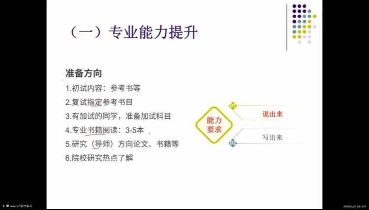 公共关系学专业由顾晓霞老师主讲。顾老师引导考生系统梳理科研课题、社会实践及工作经历,明确个人成长与深造动机。她建议结合个人优势准备高频问题,适时联系意向导师,并强调仪容仪表清爽得体、心态平稳从容。顾老师还提出通过研读顶刊文献追踪前沿动态,提升科研素养;通过模拟面试锤炼表达技巧,将过往经历转化为研究生学习的能力证明,全面提升复试竞争力。