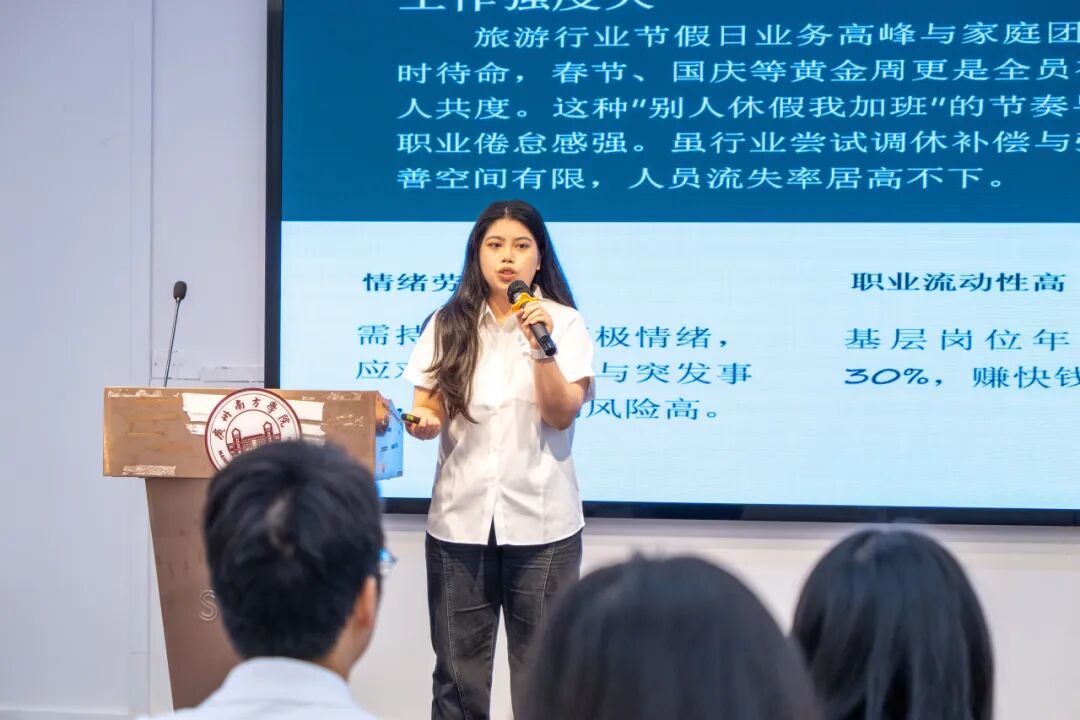 该团队分享了旅游管理行业概述、旅游与酒店行业职业分析、岗位能力要求,以及通过对东方宾馆、携程、广之路三家企业的走访调研及访谈记录,重点分析了数字化治理背景下旅游行业的职业现状、从业挑战及人才需求。团队明确了旅游管理岗位的能力要求与职业发展路径,旨在帮助行政管理专业学生找准定位,提前培养“服务+技术+管理”的复合能力。