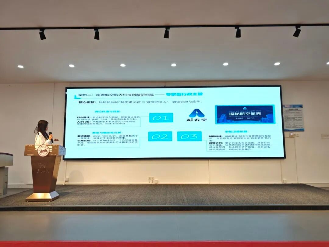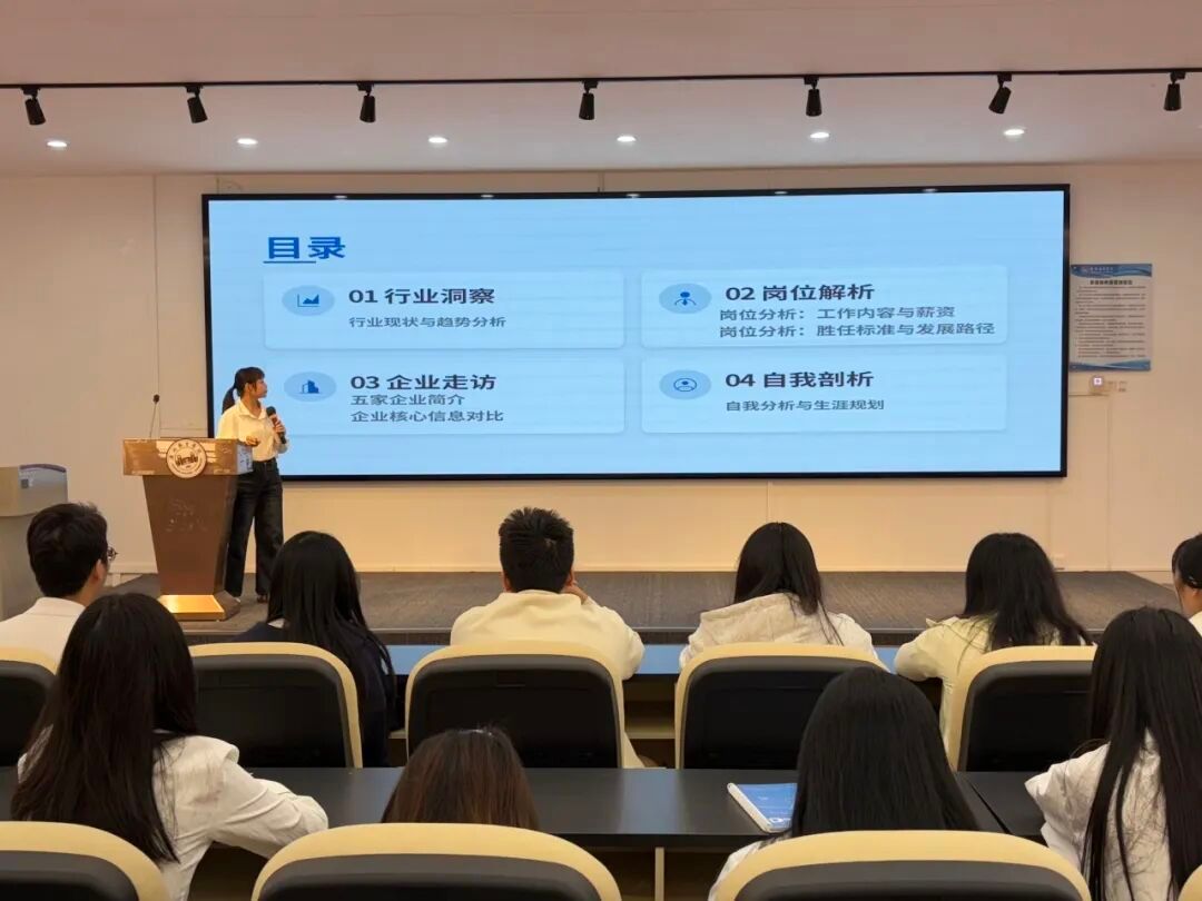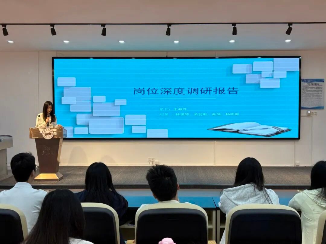 走访结束后,各团队将调研的“干货”整理成一份份详实的行业岗位分析报告。汇报现场,团队的队长们结合PPT,从企业概况、岗位职责、胜任力模型到行业发展趋势,进行了复盘与剖析。大家不再停留在书本理论,而是用真实的数据和案例,呈现出对不同行业的深度思考。
