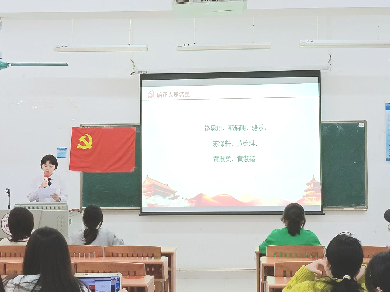 首先由饶思琦、郭炳明等7名预备党员依次上台汇报预备期间的思想、工作以及学习情况。随后,由入党介绍人分别对7名预备党员在预备期间内的表现情况进行总结。最后,大会采用无记名投票的方式对是否同意7名预备党员的转正申请进行了表决。经计票统计,支部与会党员一致同意7名同志按期转正。