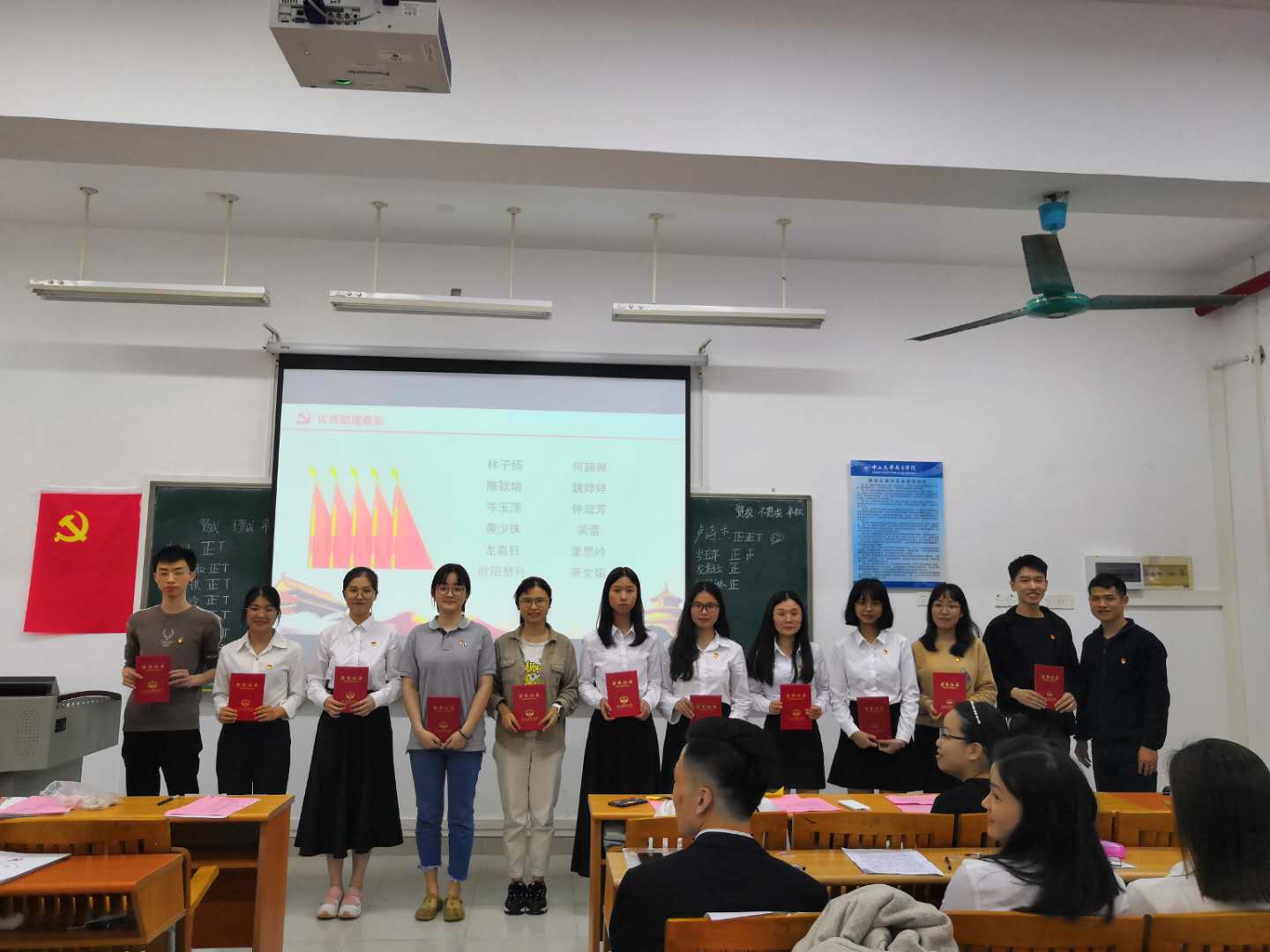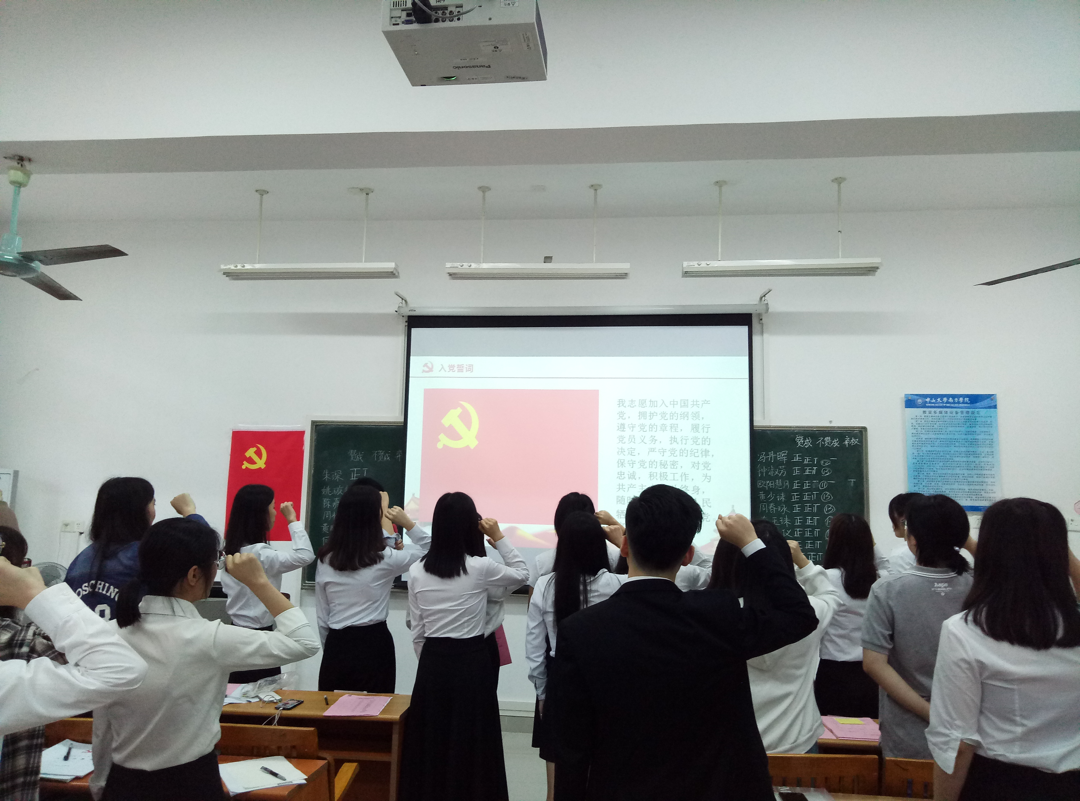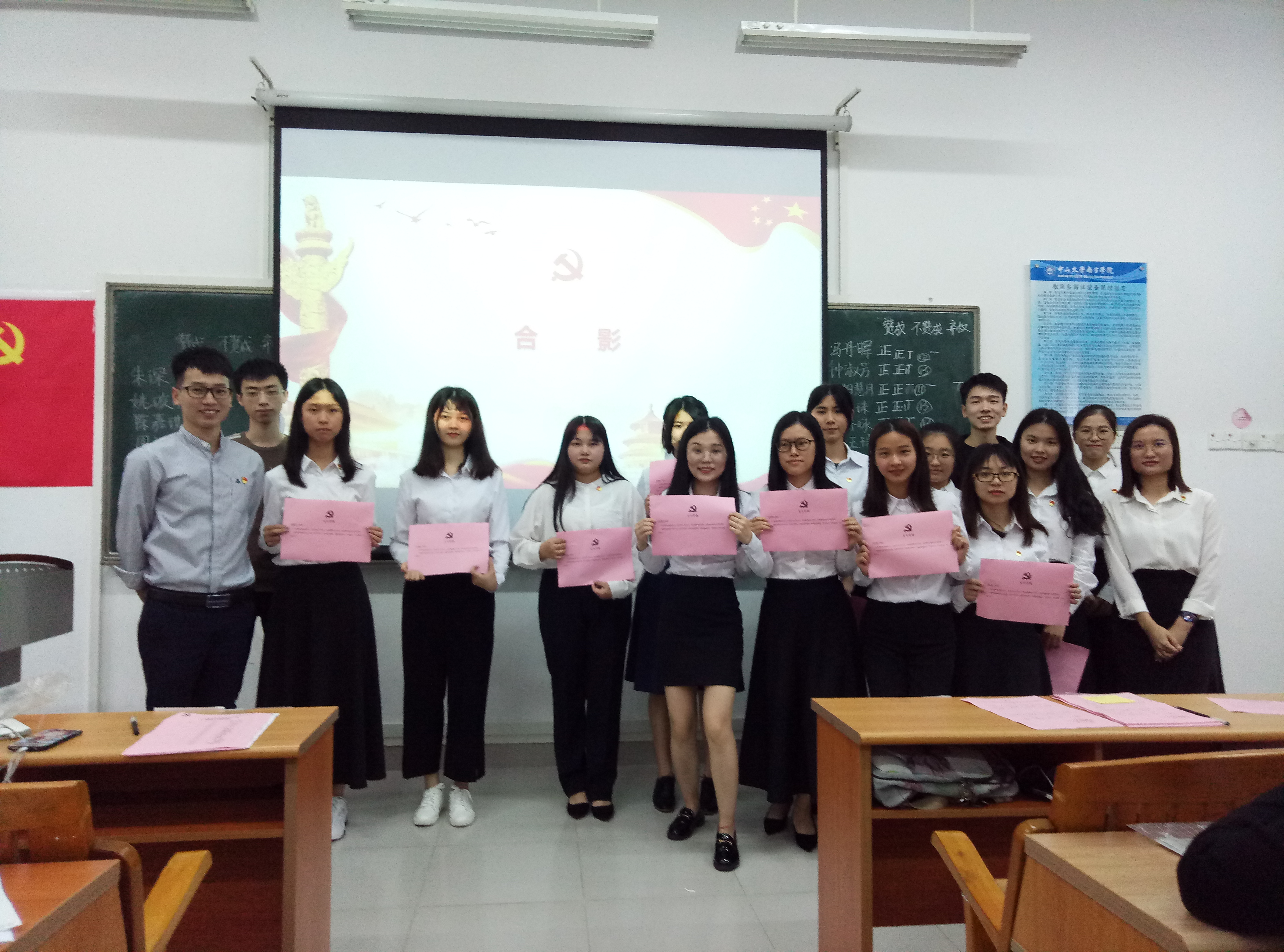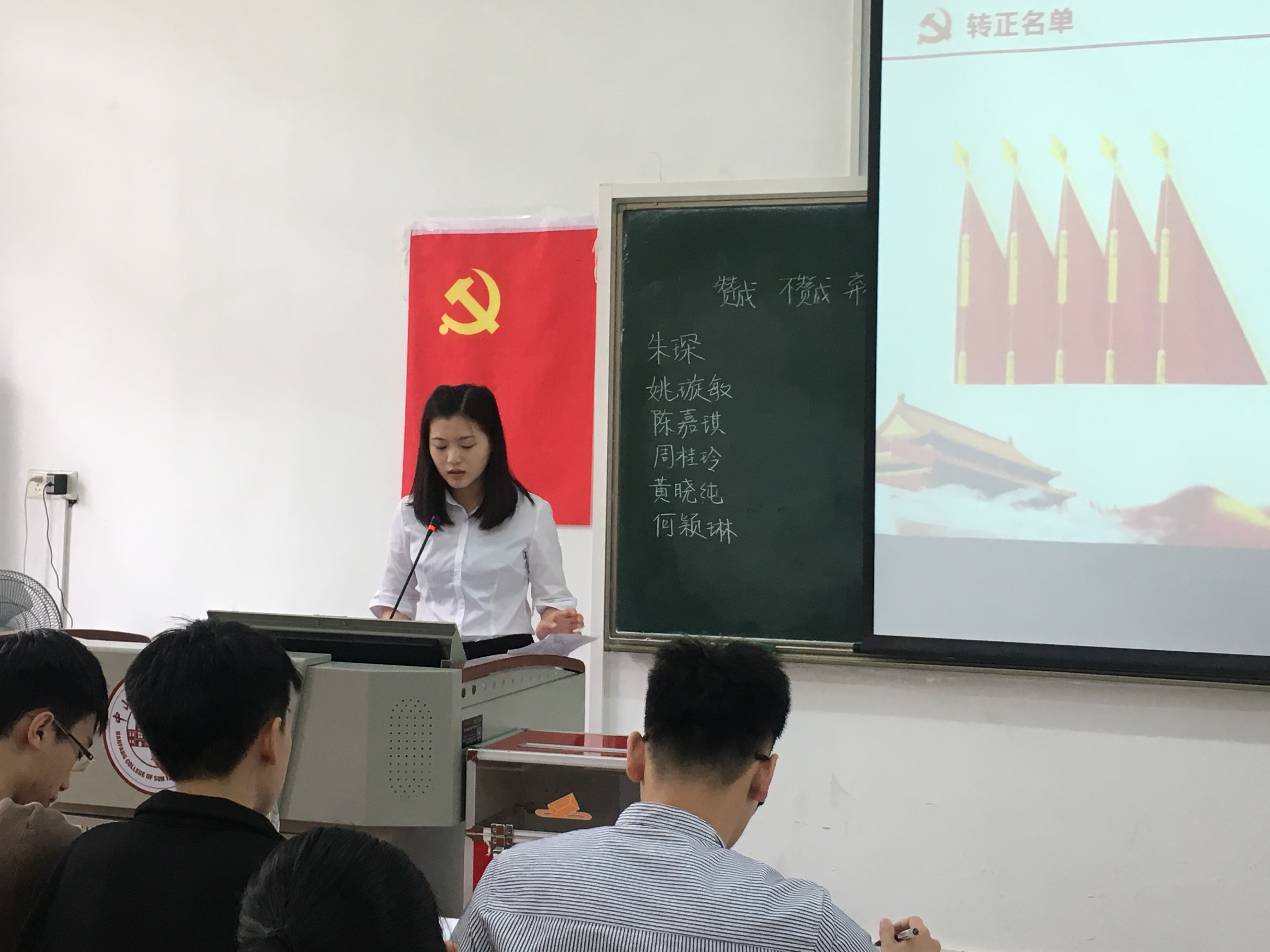 钟淑芳等11名发展对象对自身思想、生活、学习等情况进行汇报,由入党介绍人分别对11名发展对象依次发表入党介绍意见,并通过与会的正式党员的无记名投票表决,由支委林子扬同志宣读支部决议,同意钟淑芳等11名发展对象接收为中共预备党员。