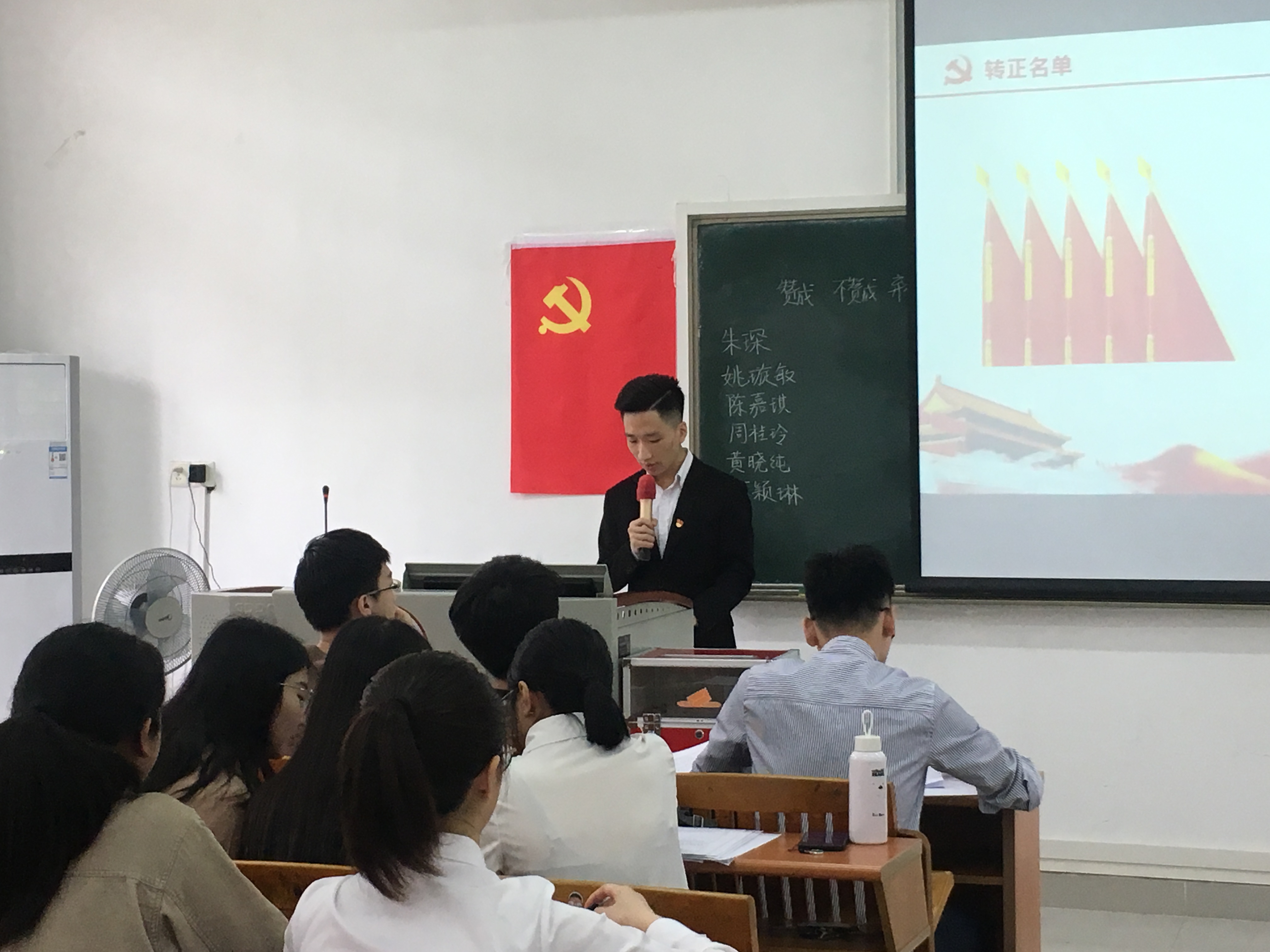 首先,由朱琛等6名预备党员依次上台,就个人在预备期间的思想、学习、工作和生活中的表现,做了总结性思想汇报。紧接着,由入党介绍人分别对6名预备党员在考察期内的情况逐一提出发表意见。随后,与会的正式党员进行无记名投票;最后由卢诗杰老师宣读支部决议,一致同意朱琛等6名预备党员如期转为成为中共正式党员。