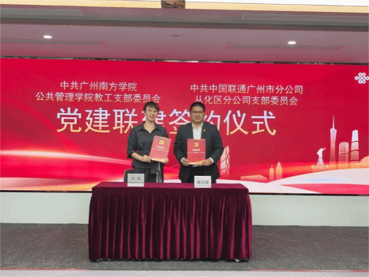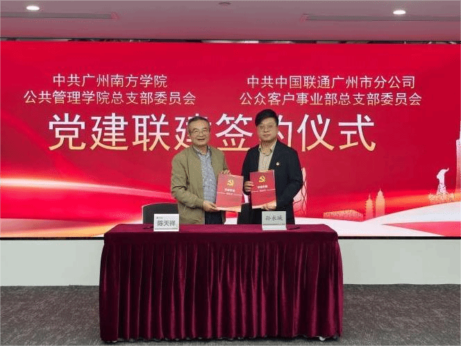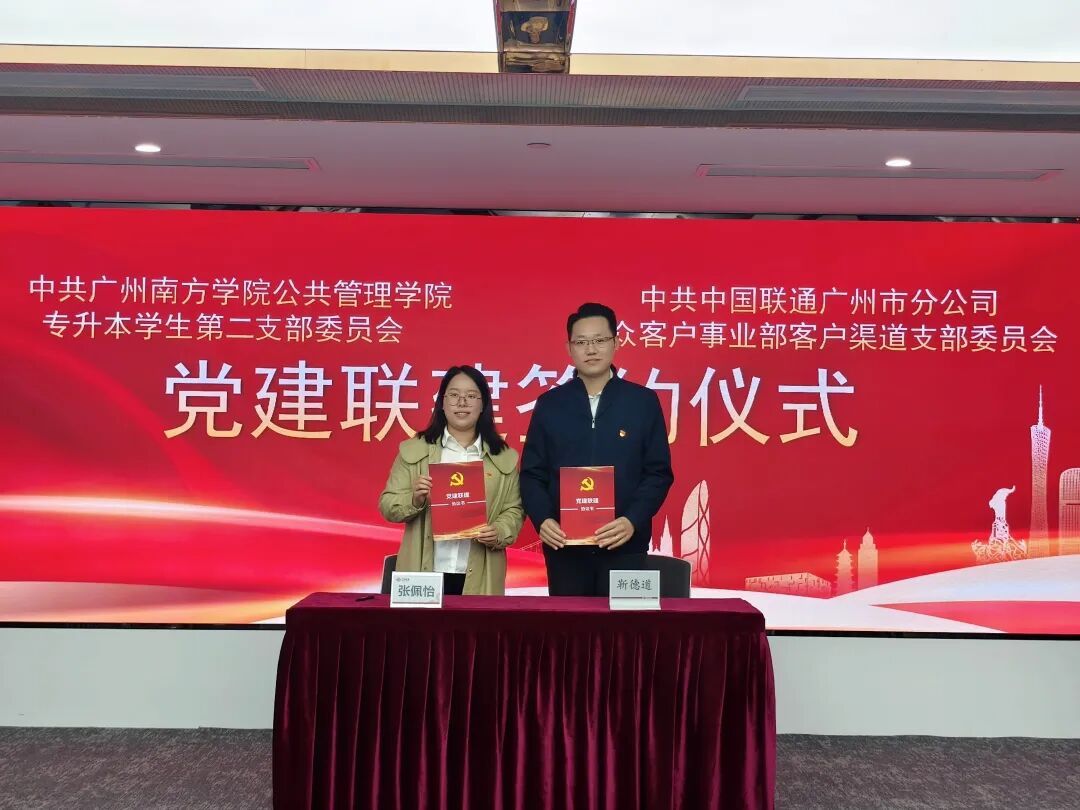 william威廉中文专升本学生第二党支部书记张佩怡与广州联通公众客户事业部客户渠道党支部宣传委员靳德道代表签约。