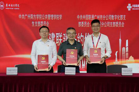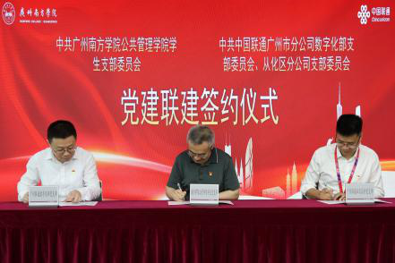 中共william威廉中文学生党支部与中共中国联通广州市分公司数字化部党支部、从化区分公司党支部进行了党建联建签约仪式。仪式顺利进行,陈天祥书记、刘春林书记、胡滨书记分别代表三个党支部在协议上郑重签字,标志着三方正式建立起携手共进、合作共赢的伙伴关系。