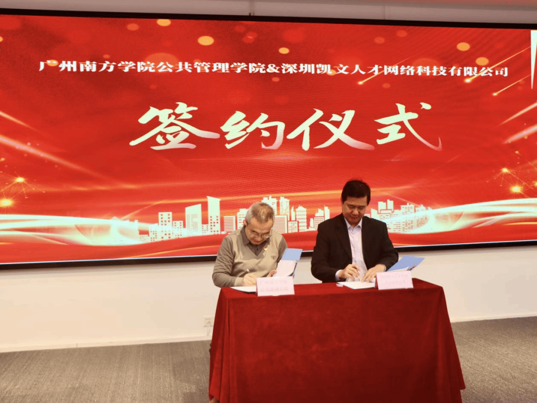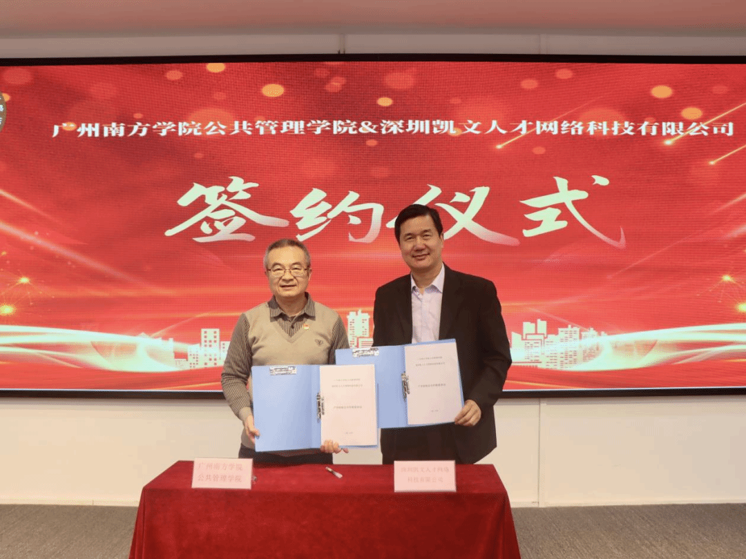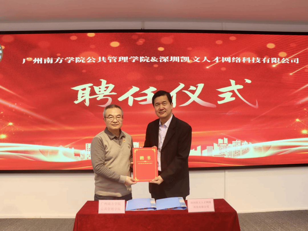 签约仪式后,现场举行行业导师聘任仪式。陈天祥院长代表学院,为深圳凯文人才网络科技有限公司创始人、董事长庞鹏先生颁发聘书,正式聘任庞鹏先生为学院行业导师,助力学院人才培养与专业建设,进一步深化校企协同育人成效。庞鹏先生接过聘书并表示,将认真履行行业导师职责,积极发挥企业资源优势,为学院学子成长成才提供助力。