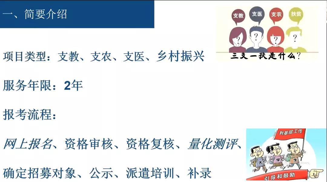 岑玉萍师姐首先向我们简要介绍了“三支一扶”的内容,她指出,三支一扶是一个基层服务项目,招募高校毕业生到农村或基层工作,服务年限一般为两年。该项目的服务类型为支教、支农、支医、乡村振兴。报考流程为网上报名、资格审核、量化测评、确定招募对象、公示、派遣培训、补录。她表示,网上报名和量化测评这两个环节比较重要。
