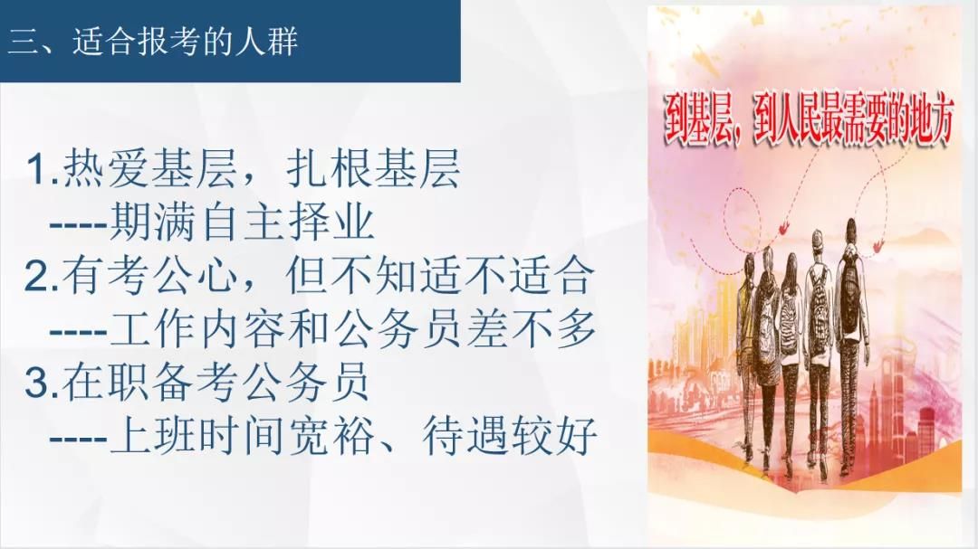 对于自身是否适合报考“三支一扶”服务项目的问题,岑玉萍师姐指出以下的三类人是适合报考的。一是热爱基层,愿意扎根基层的同学。服务期满后同学们可自主择业,且少数人可获得报考公务员或事业编单位的加分政策优惠。二是有考公想法,但不知道自己适不适合考公的同学。“三支一扶”项目工作内容与公务员工作内容类似,可以积累经验。三是适合在职备考公务员的同学。“三支一扶”项目工作上班时间固定,待遇较好,有更多时间备考公务员。
