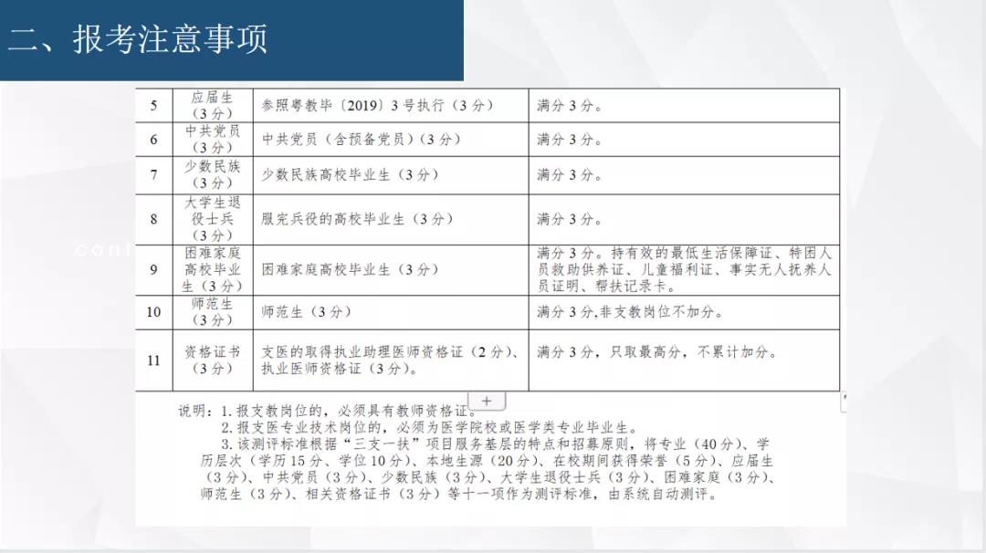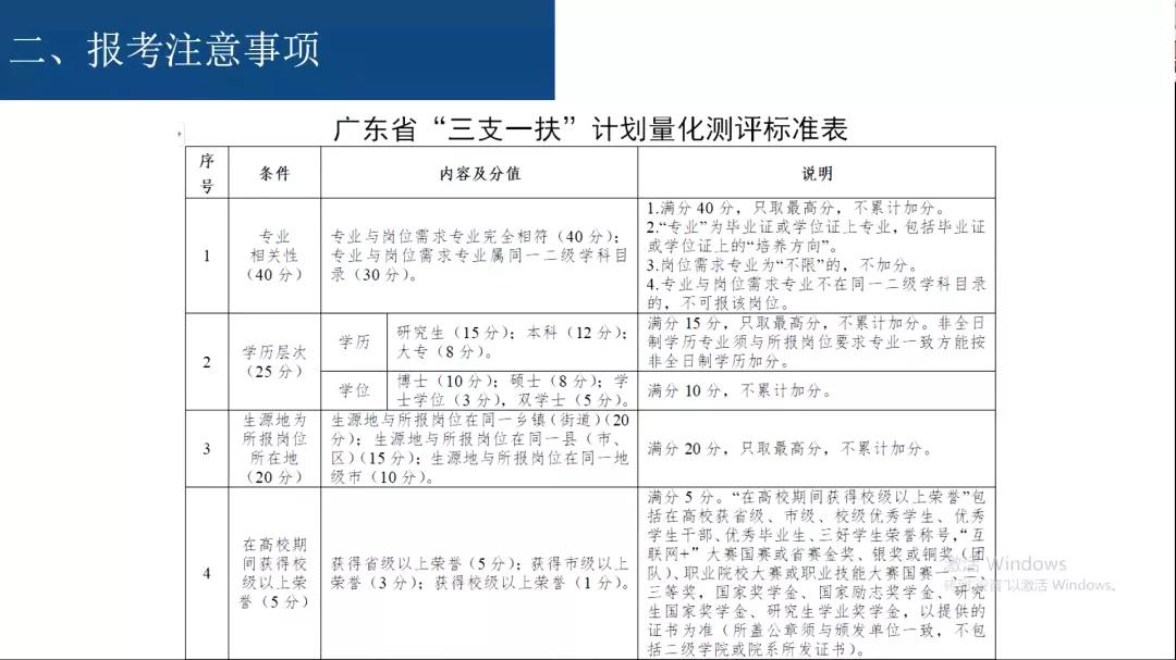 紧接着,岑玉萍师姐向我们指出报考“三支一扶”的注意事项,她告诉我们在填写报名表时应该将每一项内容都认真填写,不要留空。她提醒我们应届毕业生和往届毕业生的报考标准是不一样的,报名的时候要留意。此外,她向我们详细地分析了广东省“三支一扶”计划量化测评标准。她认为前四个条件是最容易得分的,报考岗位专业符合性越高得分越高,报考岗位时最好选择生源地所在地,贴合度越高得分越高,而同学们在校期间获得的校级、市级、省级的证书都可填上去,宁愿填错填多也不要漏填,后期会有学校进行审核。她建议有意愿参加“三支一扶”项目的同学在大四毕业时报考,因为应届生会比往届生多三分的优势。