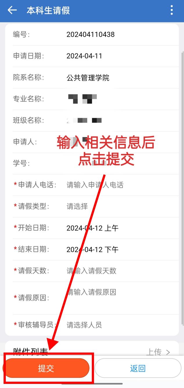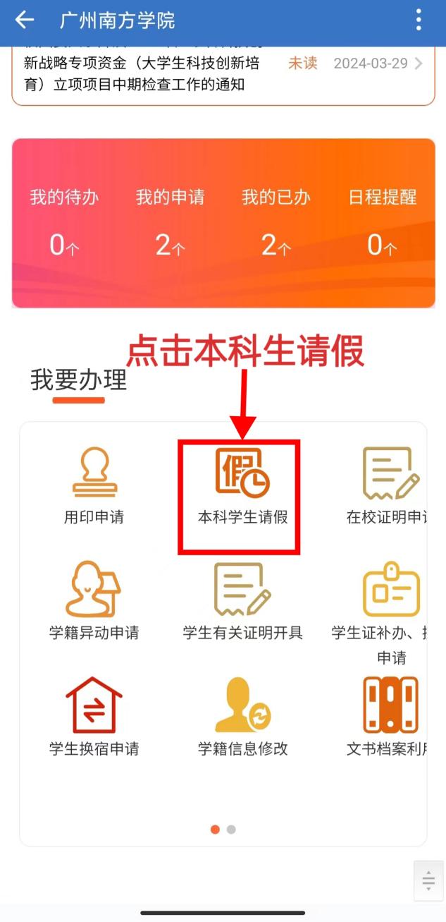 打开企业微信→点击工作台→点击办事大厅→点击本科学生请假→填写相关信息后点击提交→等待辅导员批示通过→院系办公室审批通过→完成请假