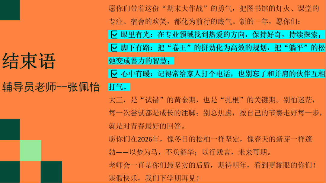 我院通过上述一系列扎实具体的措施,将期末迎考的各项工作要求落实落细,致力于为学生们冲刺期末、顺利完成学业创造最优条件。学生的健康与成长是我们始终坚守的责任。我院将继续密切跟踪学生动态,协同各方力量,全力保障学生们平稳、顺利、健康地度过期末考试周,为本学期工作画上圆满句号。