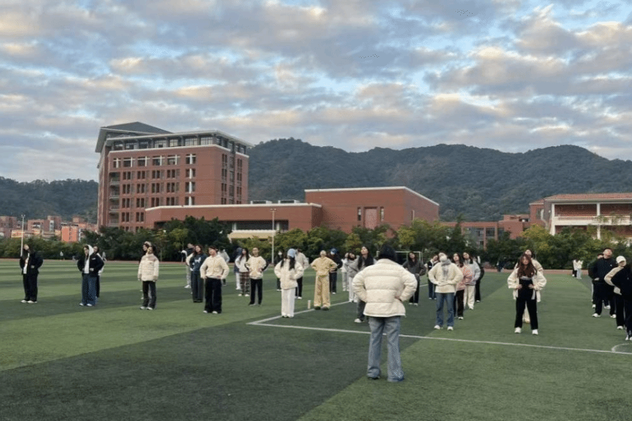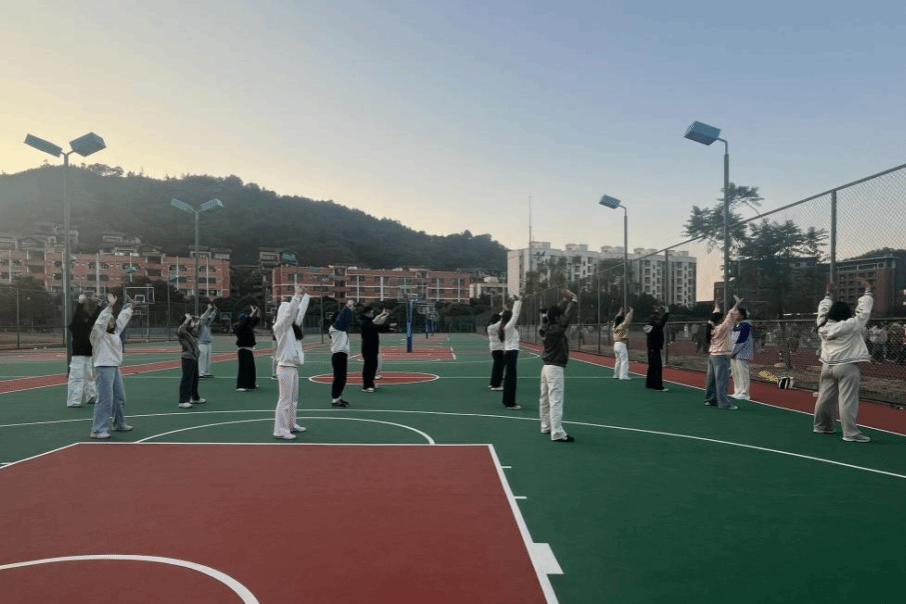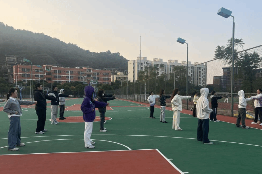 7:20-7:40的晨练环节接续精彩。在李欣华、杨雨湘、孔焯荥、韩婧仪等晨练小老师的专业带领下,大家沉浸式练习八段锦与24式太极拳,在慢节奏中琢磨招式细节,既舒展身体,又感受传统养生文化的韵味。同学们分享着从“早起困难户”到“晨练打卡族”的蜕变,从身体舒展到心态沉淀,每一份真挚感悟都让集体锻炼更具温度。