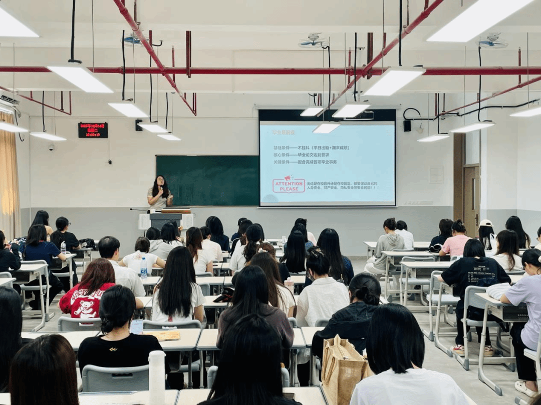 辅导员姚凡老师、宣伟男老师则围绕 “认清就业新形势、明确就业核心任务、掌握就业关键能力、用好就业支持资源、树立就业正确心态” 五大模块展开指导。通过数据解读就业环境,明确2026届全国高校毕业生预计达1593万,同时梳理出新能源、人工智能等战略新兴产业,公务员、国企等稳定领域,直播电商、碳管理等新兴领域三大机会方向;细化就业时间轴,引导备考学生按时完成考公、考研报名工作;推荐校内就业公众号、国家大学生就业平台等信息渠道,提醒警惕虚假招聘;建议通过每日完成1项就业任务(如修改简历、投递岗位)缓解焦虑,专注自身成长节奏。此外,两位老师还着重提醒毕业生及时登录“广东大学生就业创业”微信小程序绑定生源信息,积极参与神岗实训基地招聘会,为就业提前蓄力。