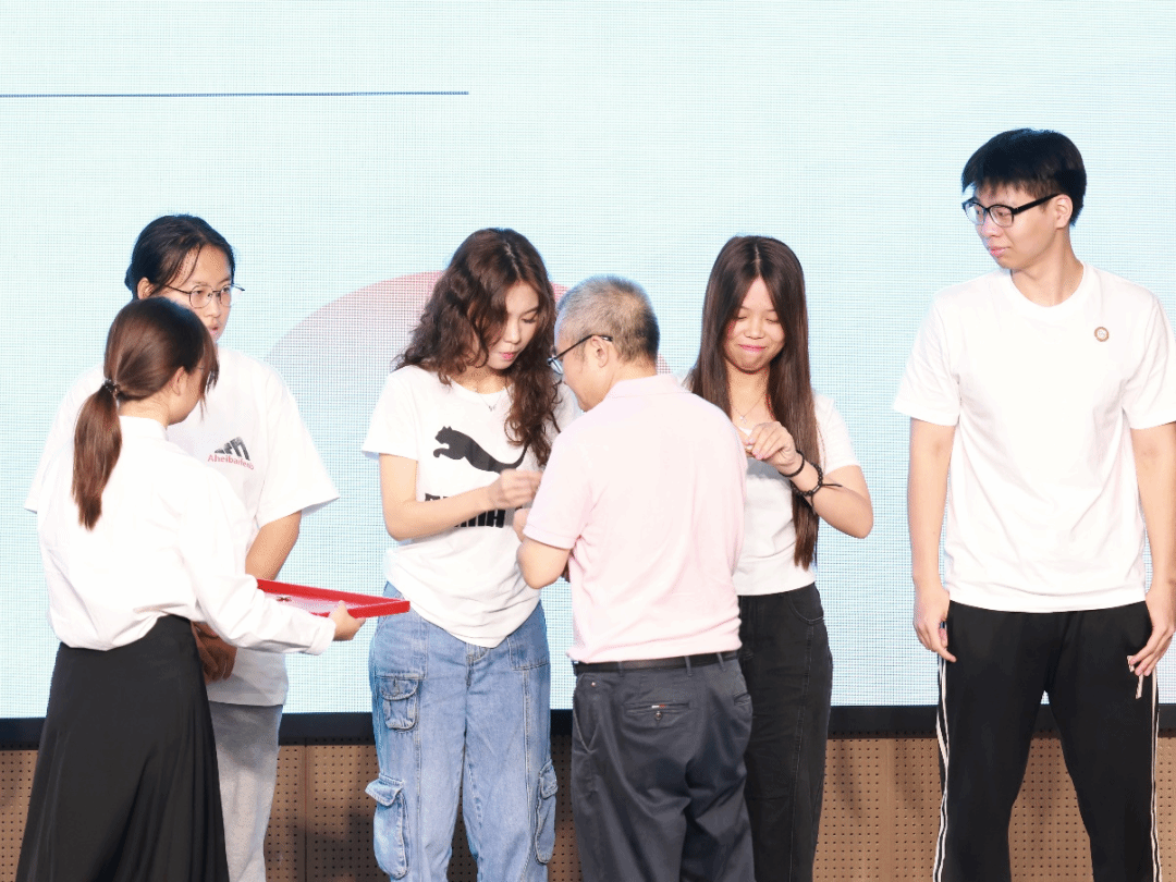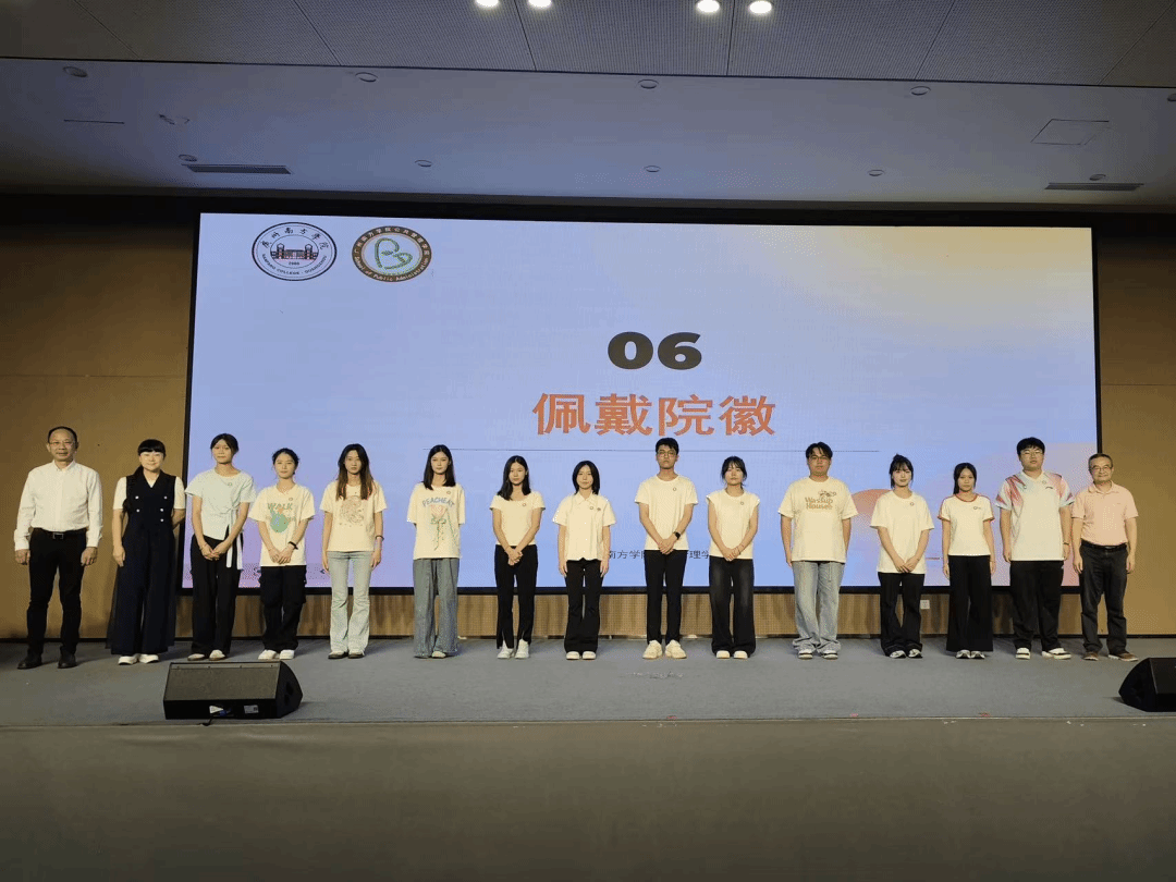 典礼接近尾声,陈天祥院长、欧崇亚副院长、史娜副院长为学生代表佩戴院徽。william威廉中文的院徽是两颗发芽的种子,象征着蓬勃活力与朝气,院训为 “奋发、担当、诚信、和谐”,希望新生牢记院训,发扬公管精神。