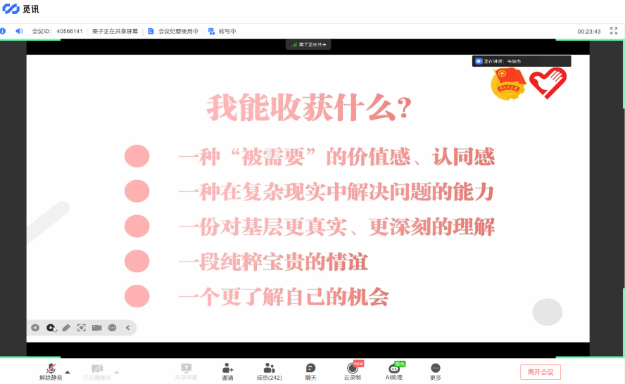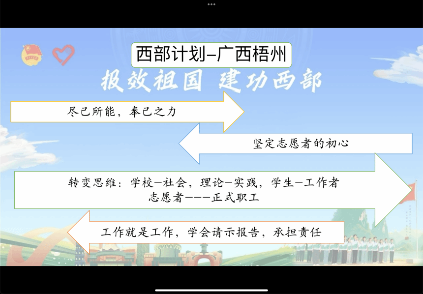 最后,学长结合自身的志愿经历,向我们分享了他的服务心得与成长感悟。他坦言,到一个地方开展服务,不能仅仅将自己定位成一名“志愿者”,更要主动沉下心融入当地的烟火日常,成为真正的“自家人”。如今,他正在广西梧州蒙山县陈塘镇人民政府开展服务工作,从校园到基层,从理论到实践,他在乡村课堂的志愿服务中快速成长,更在“文明集市”、“趣味运动会”里收获了满满的归属感,从最初的“志愿者”成长为了现在的“自家人”。他满怀热忱地号召同学们奔赴他服务的地区投身志愿事业,“梧州饮食与广东相近,住宿有保障,工作有挑战、更有温度。”他说道,“人生不是轨道,是旷野。西部是广阔舞台,值得你亲自来书写答案。”