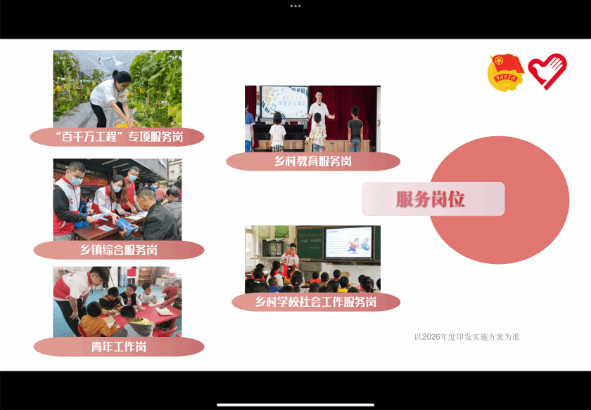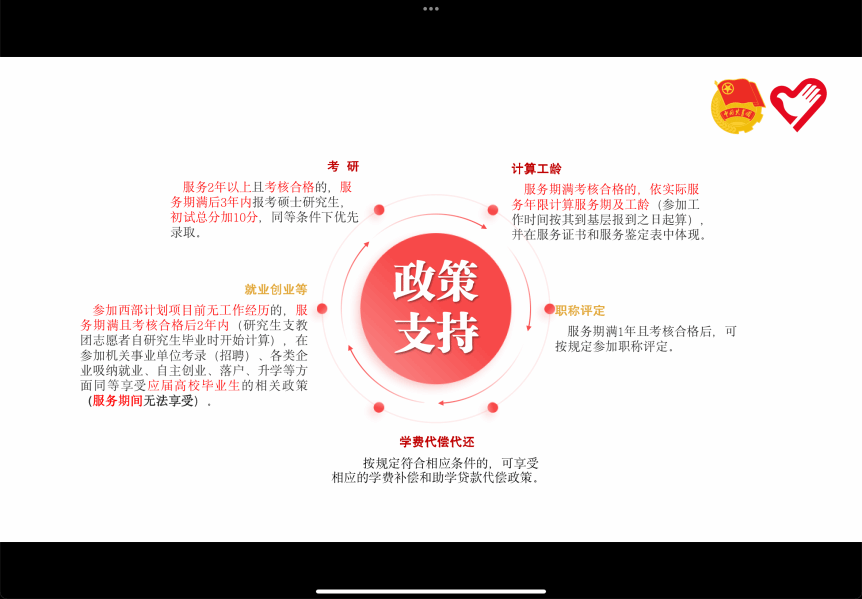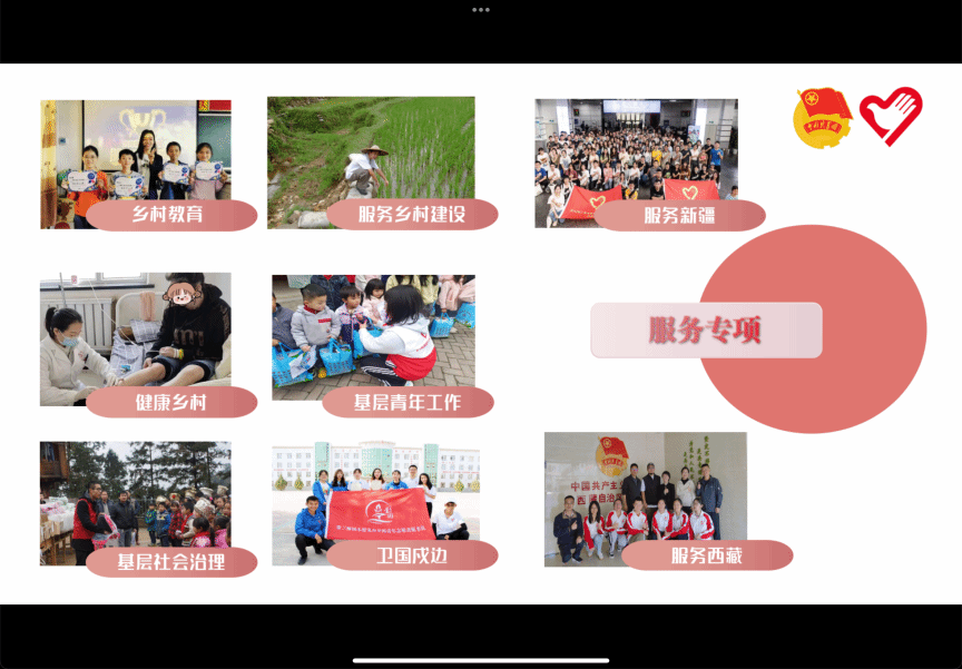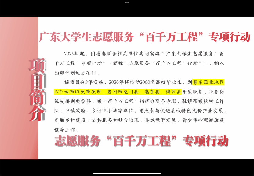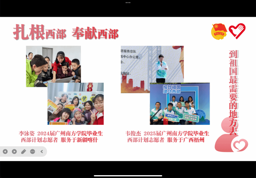 此外,韦俊杰学长从多方面介绍了西部计划广东地方项目旗下的广东大学生志愿服务“百千万工程”专项行动,其中重点讲解了“百千万工程”专项服务岗、乡镇综合服务岗、青年工作岗、乡村教育岗以及乡村学校社会工作服务岗这5个服务岗位,学长提到:以广东大学生志愿服务“百千万工程”专项行动为例,志愿者服务期为1至3年,在服务期间还可享受生活补贴、交通补贴、节日补贴、基层服务补助。学长还通过图片,带我们直观了解志愿者的生活与工作环境;更结合自身经历,为我们讲述参与这些项目的收获,鼓舞我们以行动回馈家乡、报效祖国!