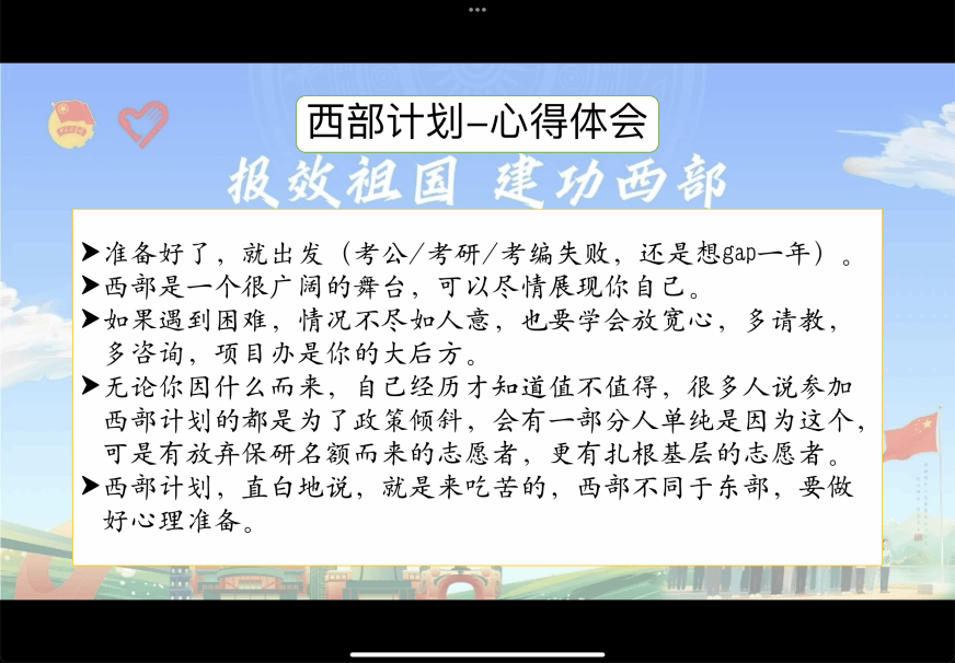 宣讲会伊始,韦俊杰学长向我们介绍了西部计划的内容,他提到西部计划是从2003年起,由团中央、教育部、财政部、人力资源社会保障部联合实施的大学生志愿服务项目,每年招募高校应届毕业生或在读研究生到西部基层开展1—3年志愿服务。学长结合身边人和自己的经历,重点介绍了西部计划的乡村教育、服务乡村建设、健康乡村、基层青年工作、乡村社会治理、卫国戍边、服务新疆、服务西藏这8个服务专项以及各专项的具体服务方向。随后,学长还为我们深入解读了西部计划的政策支持,加深了我们对西部计划的认识。