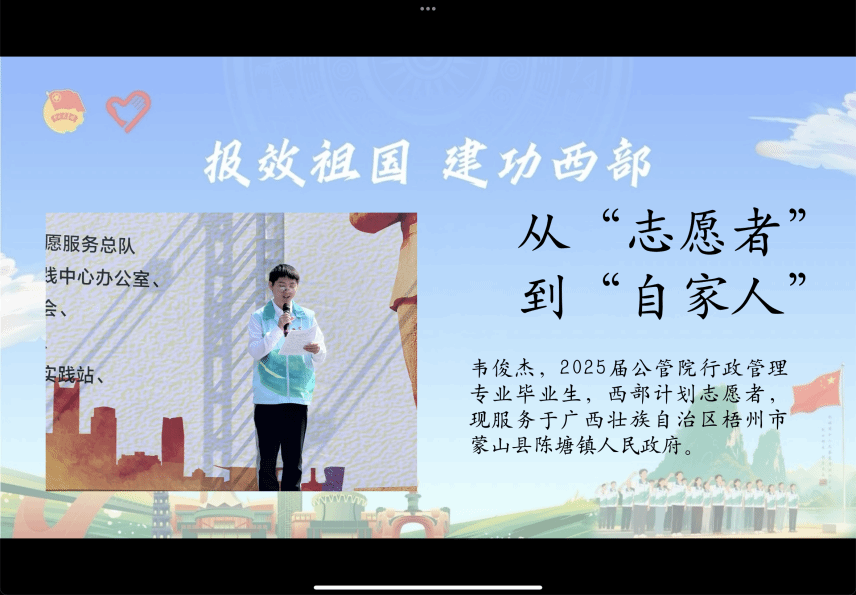 韦俊杰,2025届行政管理专业毕业生,西部计划志愿者,现服务于广西壮族自治区梧州市蒙山县陈塘镇人民政府。