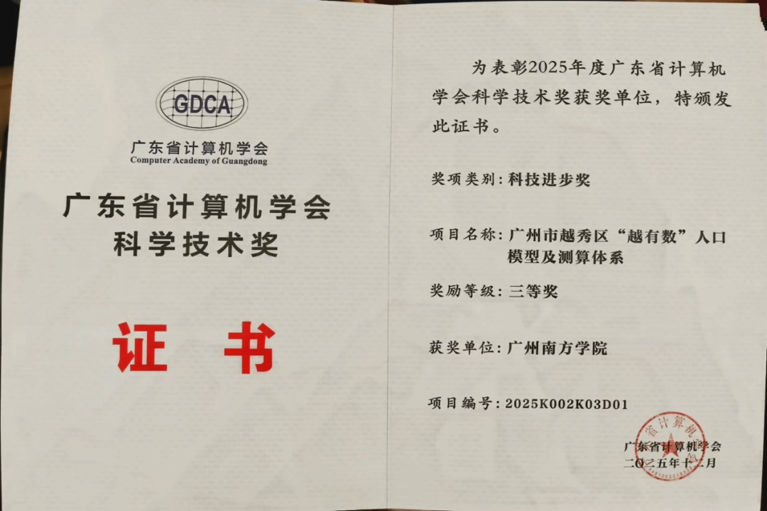 “越有数”人口模型的先行探索:早在2021年,我院便与越秀区政数局联合发布了广东首份“越有数”人口模型研究报告,并研发了基于“块数据”理念的人口治理智慧平台。该模型精准界定了“空挂户”“流水席人口”等概念,为老城区治理提供了科学决策支撑,相关成果曾亮相全国数字政府建设峰会,经数年平稳、高效运行后于2026年1月获广东省计算机学会科技进步奖三等奖。