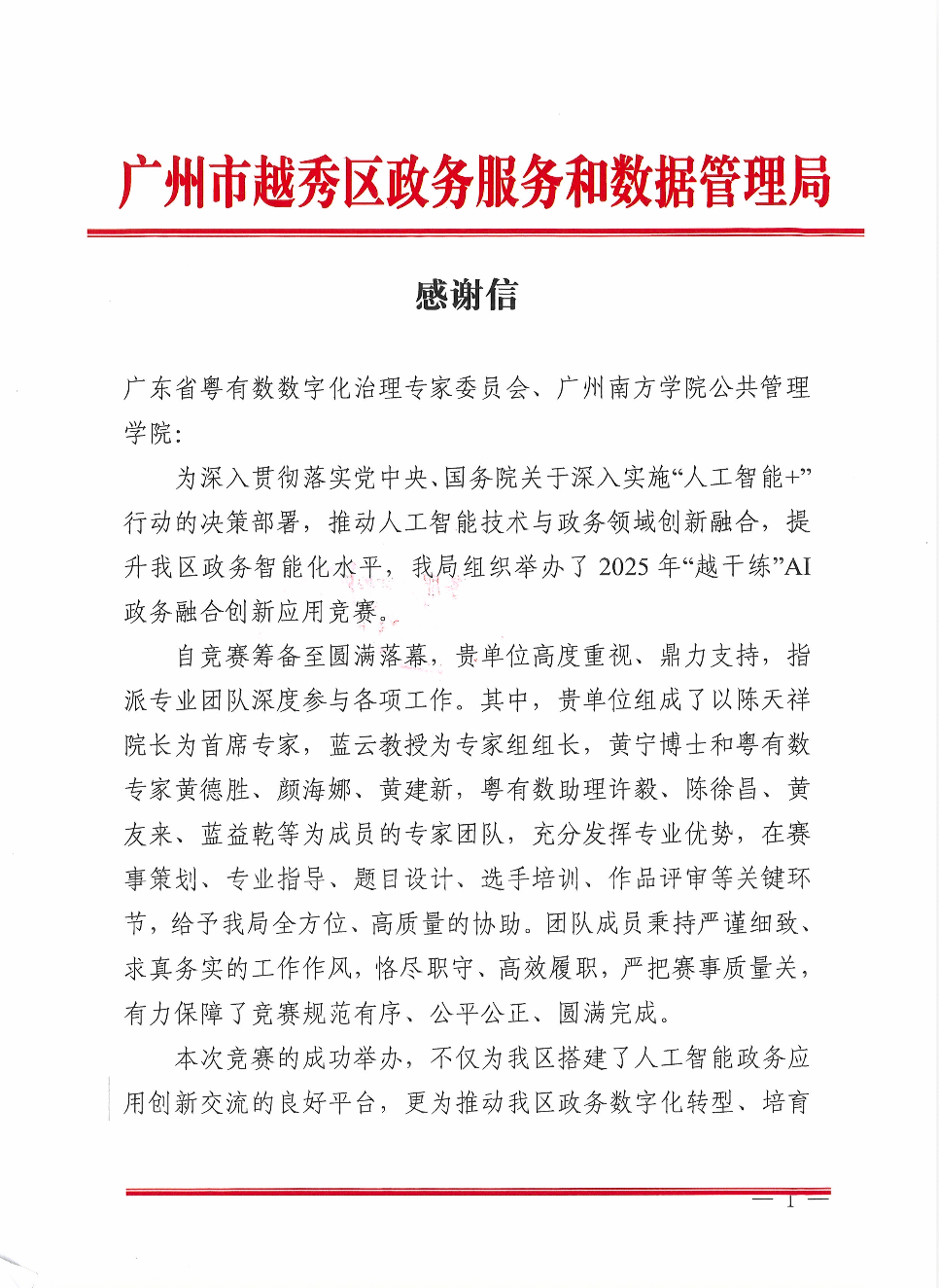 近日,广州市越秀区政务服务和数据管理局(以下简称“越秀区政数局”)向我院及广东省粤有数数字化治理专家委员会、WilliamHill中文新技术与政府治理研究中心发来感谢信,对我院在2025年“越干练”AI政务融合创新竞赛中提供的全方位智力支持表示高度认可。这标志着我院在陈天祥院长带领下,与越秀区政数局在“越有数”人口模型、数字政府协同创新基地等合作基础上,于人工智能赋能干部素质提升领域再结新果,政校合作模式持续深化。