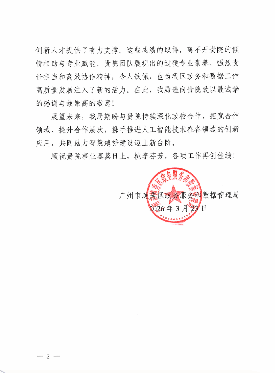 越秀区政数局在感谢信中明确表达了持续深化合作的意愿。未来,双方将依托既有的“越有数”底座与此次“越干练”AI竞赛的实践经验,进一步拓宽合作领域,在AI技术赋能城市管理、民生服务等更多场景开展创新探索,共同助力“智慧越秀”建设迈上新台阶。