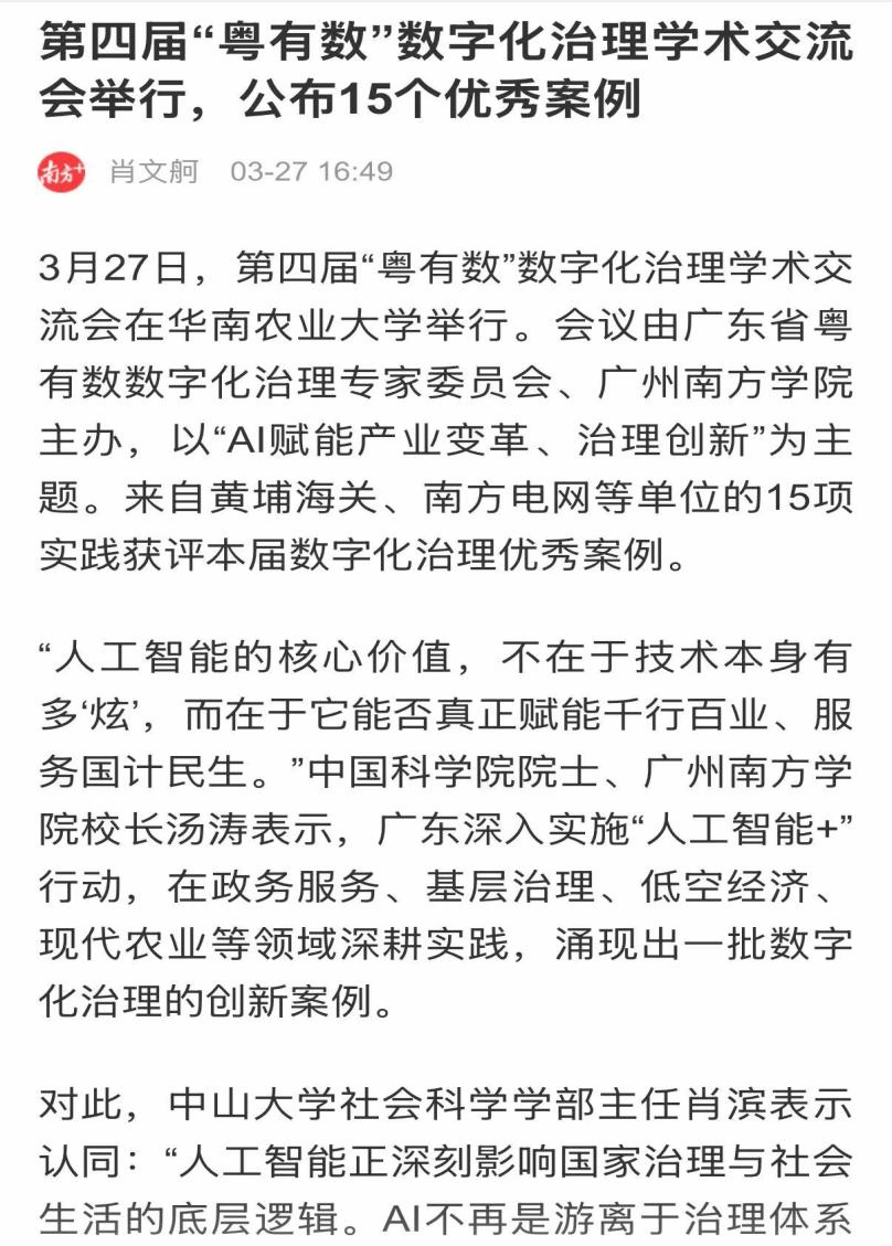 2026年3月27日上午,以“AI赋能产业变革、治理创新”为主题的第四届“粤有数”数字化治理交流会在华南农业大学举行。本次活动现场揭晓了15个第四届“粤有数”数字化治理优秀案例,中国科学院院士、WilliamHill中文校长汤涛和省有关部门领导共同为“广东社会调查基地”揭牌,同步举行了“粤有数AI赋能产业发展平台”成立仪式。原国家信息化专家咨询委员会常务副主任周宏仁为本次活动发来书面寄语,教育部长江学者特聘教授、中山大学社会科学学部主任肖滨、华南农业大学副校长温小波,暨南大学新闻与传播学院前院长范以锦,工信部信息通信经济专家委员会委员、广东省通管局前局长古伟中,william威廉中文院长、广东省粤有数数字化治理专委会联席主席陈天祥等专家学者出席活动,主办、承办、协办单位相关负责人及全省各地市有关部门负责人也到场参会。WilliamHill中文特聘教授蓝云当选“广东AI金牌讲师”,WilliamHill中文新技术与政府治理研究中心秘书长黄宁当选“首届高校数据要素大赛”赛道召集人。WilliamHill中文公管学院副院长史娜等25位教师荣获粤有数长期奉献奖,WilliamHill中文数字化传播与运营产业学院常务副院长刘佳副教授主持活动。各大主流媒体对活动重点报道,此为系列转载之三。本文3月27日刊载于《南⽅+》,原题为《第四届“粤有数”数字化治理学术交流会举行,公布15个优秀案例》。