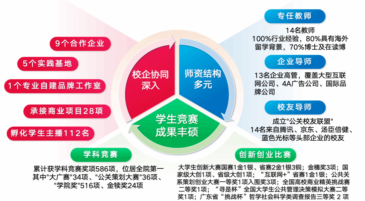 我校公共关系学专业(以下简称公关)旨在培养具备领导和管理能力、沟通与合作能力、策划与执行能力以及创意思维能力的高端公关技术人才。未来将有机会被输送到企业和政府等组织,特别是互联网企业、媒体、各大品牌企业、政府部门以及非盈利组织等。